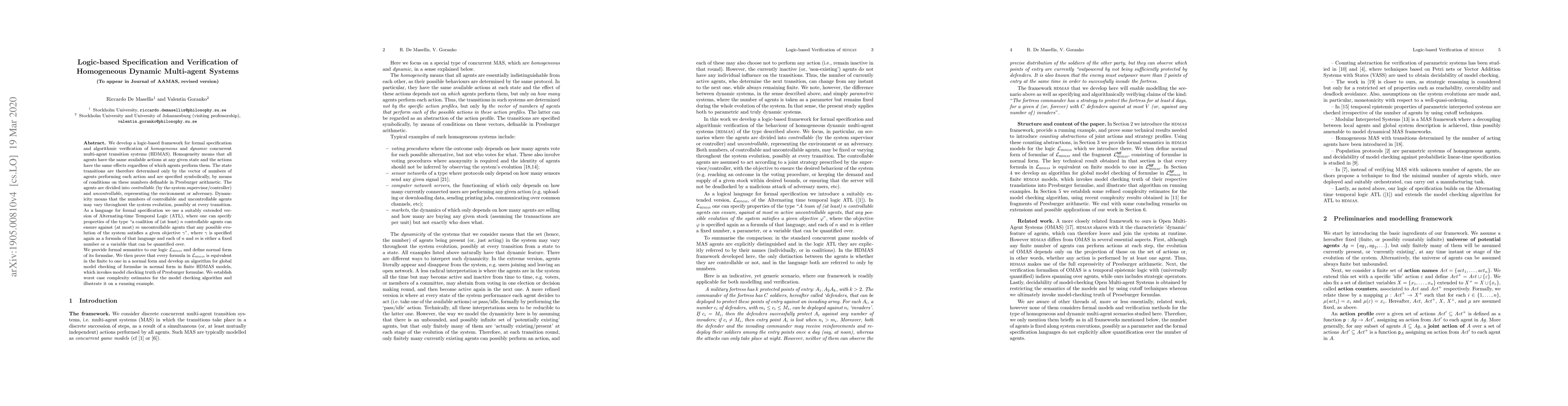 We develop a logic-based framework for formal specification and algorithmic verification of homogeneous and dynamic concurrent multi-agent transition systems (HDMAS). Homogeneity means that all agents have the same available actions at any given state and the actions have the same effects regardless of which agents perform them. The state transitions are therefore determined only by the vector of numbers of agents performing each action and are specified symbolically, by means of conditions on these numbers definable in Presburger arithmetic. The agents are divided into controllable (by the system supervisor/controller) and uncontrollable, representing the environment or adversary. Dynamicity means that the numbers of controllable and uncontrollable agents may vary throughout the system evolution, possibly at every transition. As a language for formal specification we use a suitably extended version of Alternating-time Temporal Logic (ATL), where one can specify properties of the type "a coalition of (at least) $n$ controllable agents can ensure against (at most) $m$ uncontrollable agents that any possible evolution of the system satisfies a given objective $\varphi$", where $\varphi$ is specified again as a formula of that language and each of $n$ and $m$ is either a fixed number or a variable that can be quantified over. We provide formal semantics to our logic $\mathcal{L}_{HDMAS}$ and define normal form of its formulae. We then prove that every formula in $\mathcal{L}_{HDMAS}$ is equivalent in the finite to one in a normal form and develop an algorithm for global model checking of formulae in normal form in finite HDMAS models, which invokes model checking truth of Presburger formulae. We establish worst case complexity estimates for the model checking algorithm and illustrate it on a running example.