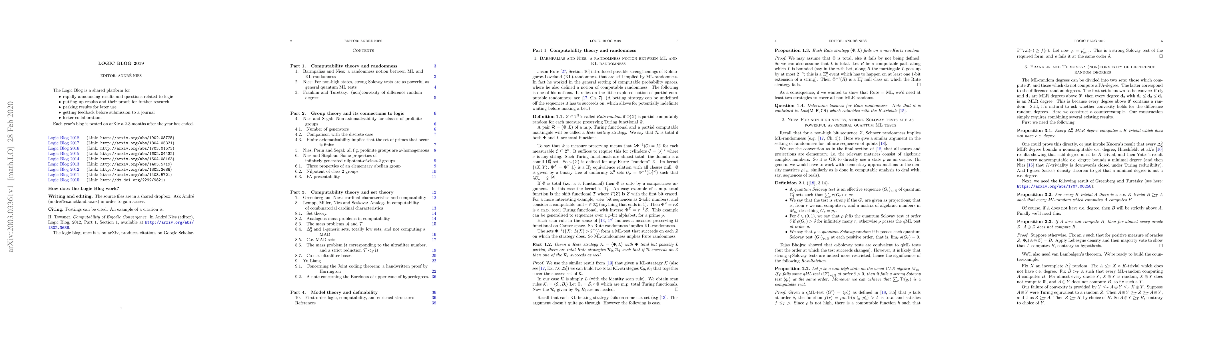 The blog focusses on algorithmic randomness and its connections to quantum information theory, group theory and its connections to logic, and computability analogs of cardinal characteristics.