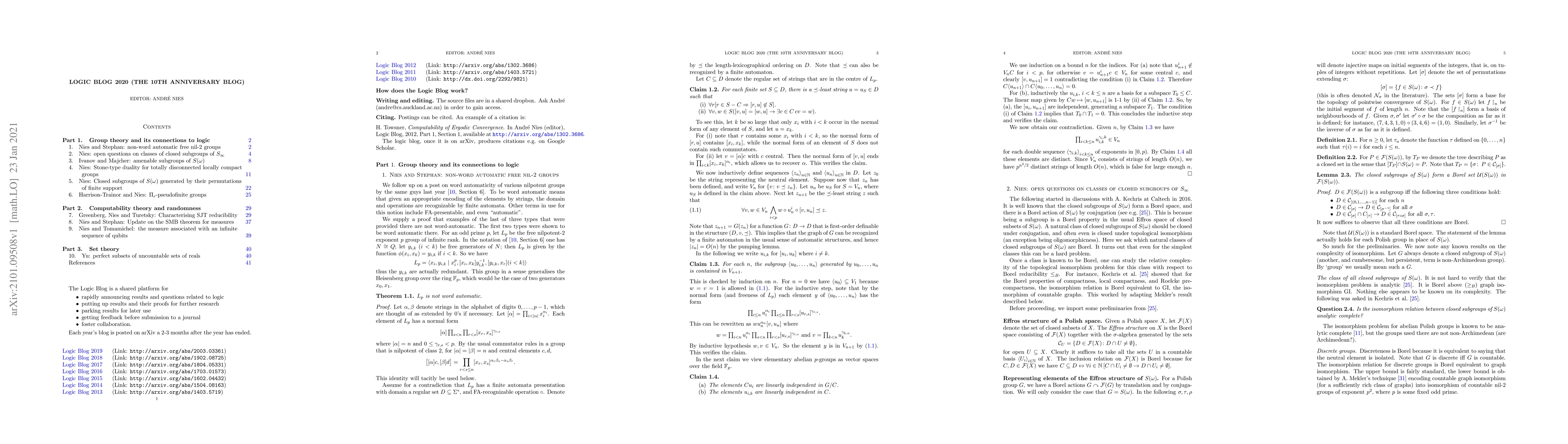 This year's blog has focused on the connections of group theory with logic and algorithms. The first post is on automata presentable groups. Then there are several posts related to topological groups, for instance Ivanov and Majcher showing that extreme amenability of closed subgroups of $S_\infty$ is a Borel property. One post due to Harrison-Trainor and Nies reviews notes by Segal on pseudofinite groups, and attempts an effective version. About 25 percent is on computability and randomness, in particular equivalence of reducibilities weaker than Turing on the K-trivials by Greenberg, Nies and Turetsky, and the effective SMB theorem in the quantum setting by Nies and Tomamichel.