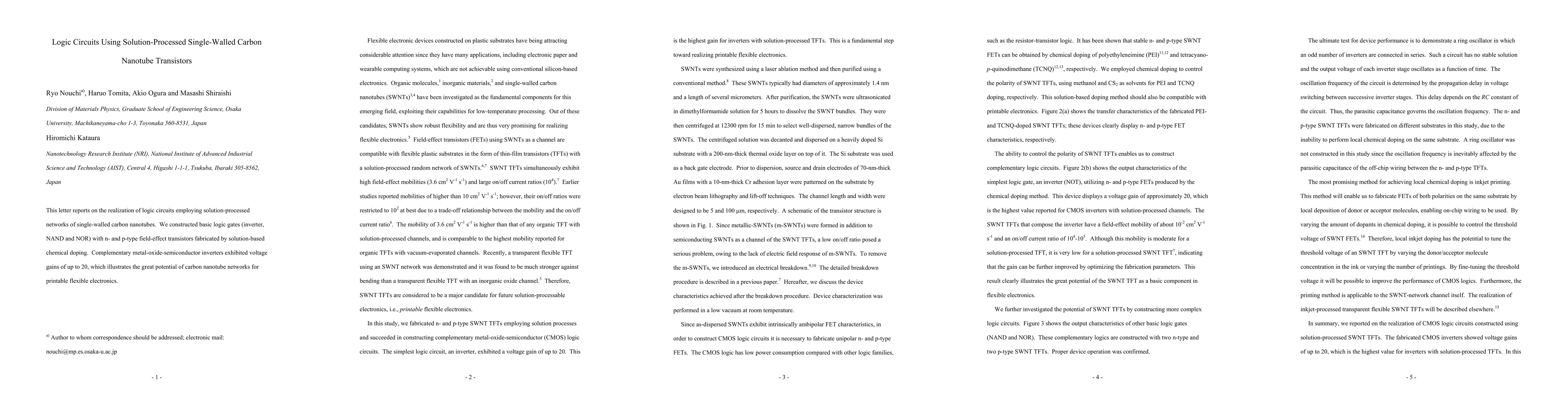 This study demonstrates logic circuits utilizing solution-processed networks of single-walled carbon nanotubes, including inverters, NAND, and NOR gates, showing voltage gains up to 20, highlighting the potential for flexible, printable electronics.
