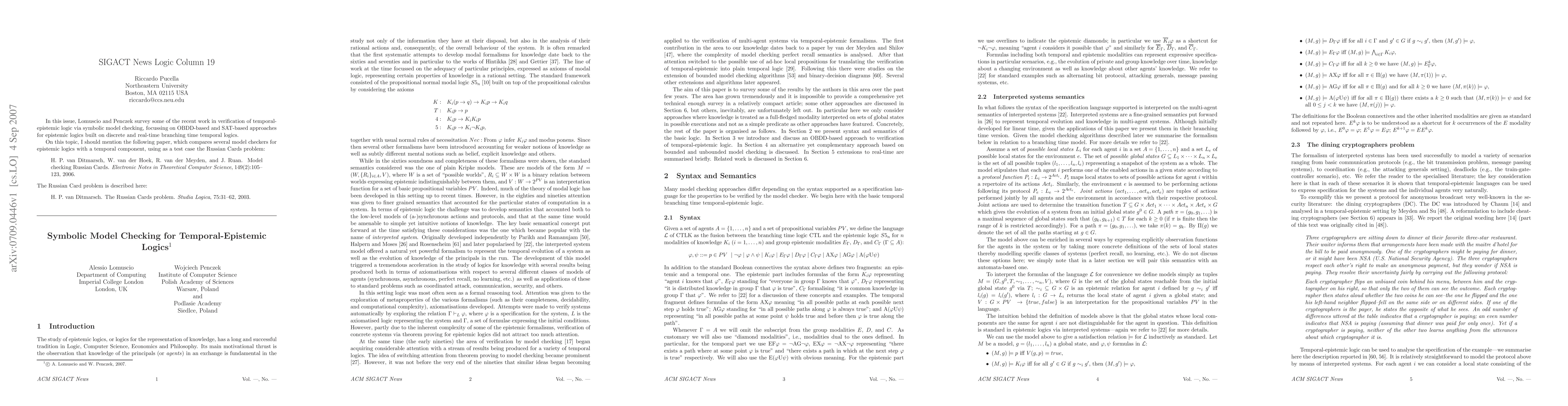 This paper surveys recent advancements in verifying temporal-epistemic logics using symbolic model checking, emphasizing OBDD-based and SAT-based techniques for discrete and real-time branching time logics. It highlights the effectiveness of these methods in epistemic logic verification.