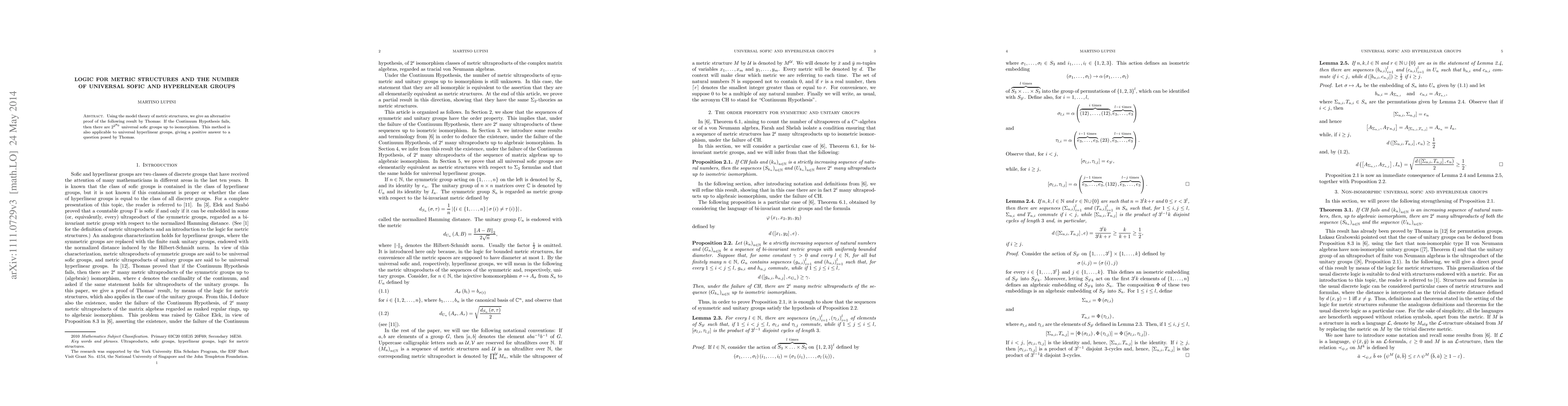 Summary: The paper provides a model-theoretic proof using metric structures to show that if the Continuum Hypothesis fails, there exist many universal sofic groups up to isomorphism. It extends this method to universal hyperlinear groups, answering a question posed by Thomas.
