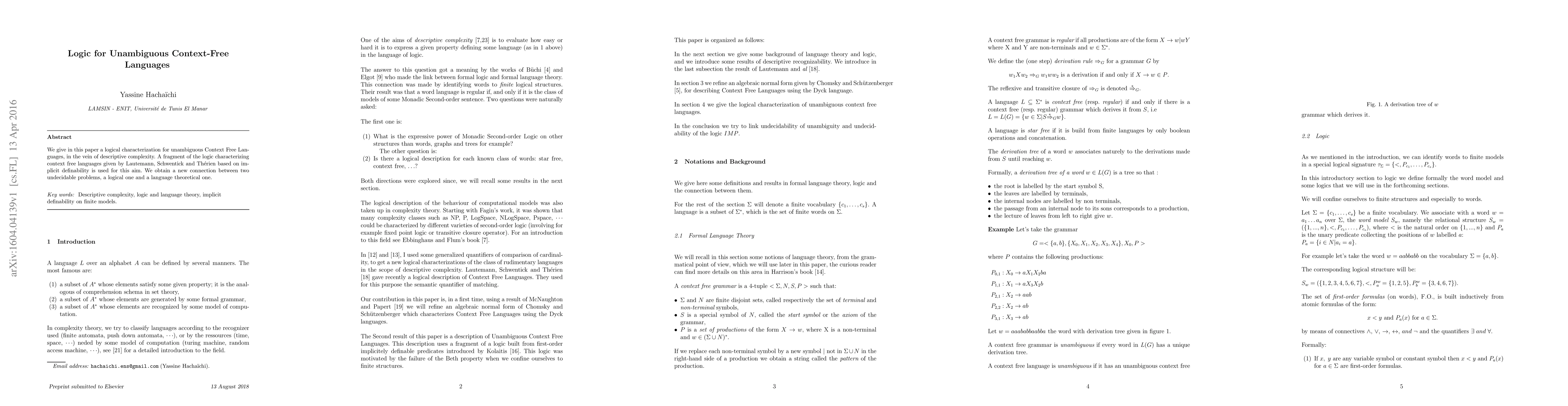 This paper presents a logical characterization for unambiguous context-free languages using descriptive complexity, building on a fragment of logic by Lautemann, Schwentick, and Th\'erien. It establishes a new link between an undecidable logical problem and an undecidable language-theoretical problem.