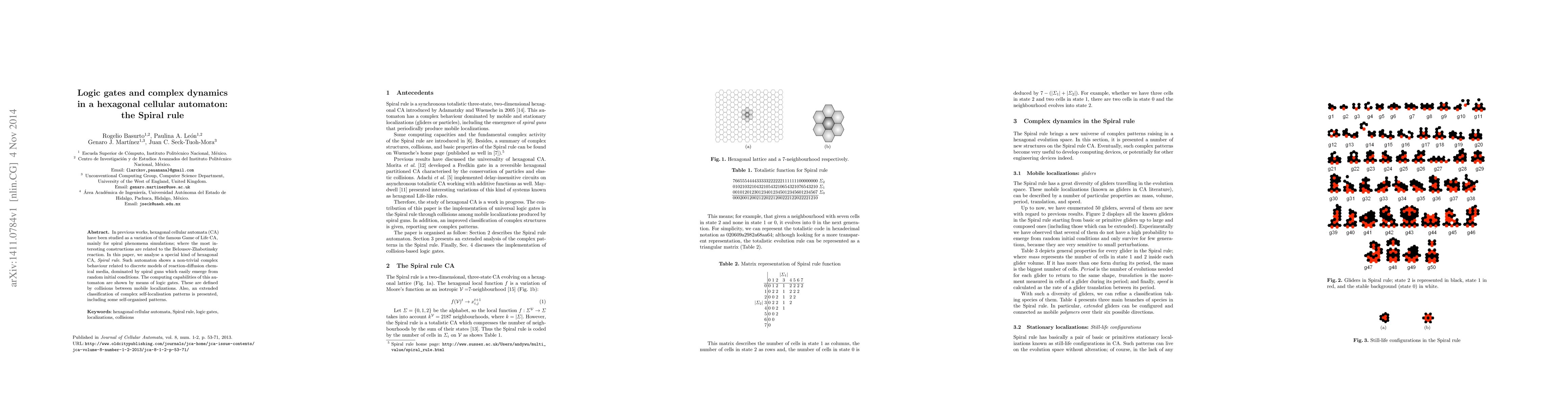 In previous works, hexagonal cellular automata (CA) have been studied as a variation of the famous Game of Life CA, mainly for spiral phenomena simulations; where the most interesting constructions are related to the Belousov-Zhabotinsky reaction. In this paper, we analyse a special kind of hexagonal CA, {\it Spiral rule}. Such automaton shows a non-trivial complex behaviour related to discrete models of reaction-diffusion chemical media, dominated by spiral guns which easily emerge from random initial conditions. The computing capabilities of this automaton are shown by means of logic gates. These are defined by collisions between mobile localizations. Also, an extended classification of complex self-localisation patterns is presented, including some self-organised patterns.