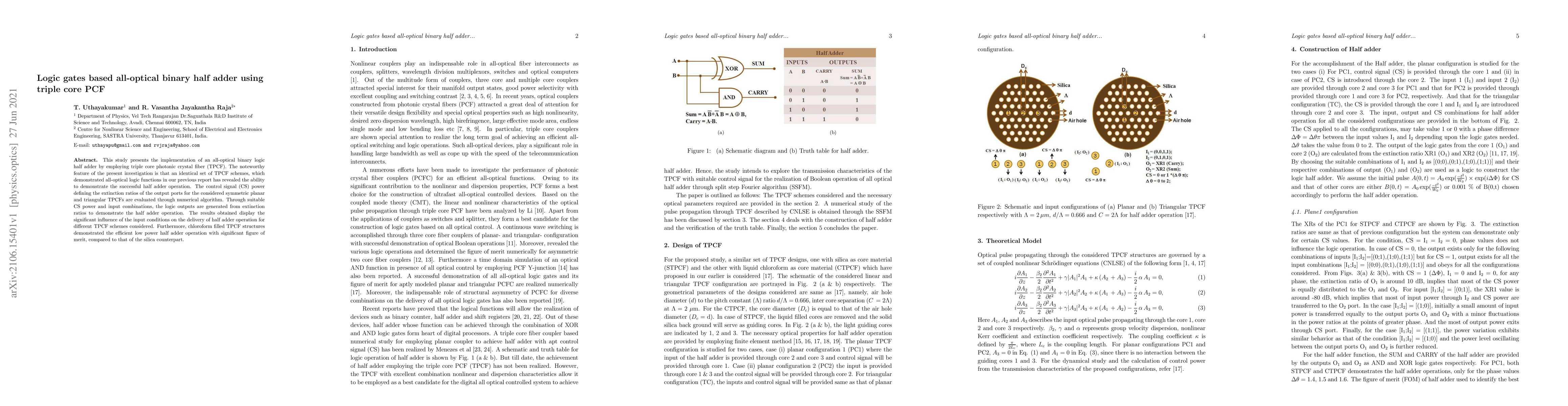 This paper presents an all-optical binary half adder using triple core photonic crystal fiber (TPCF), demonstrating successful logic operations through numerical evaluation of control signal power. The study shows that chloroform-filled TPCF structures provide efficient, low-power half adder operations compared to silica-based TPCF.