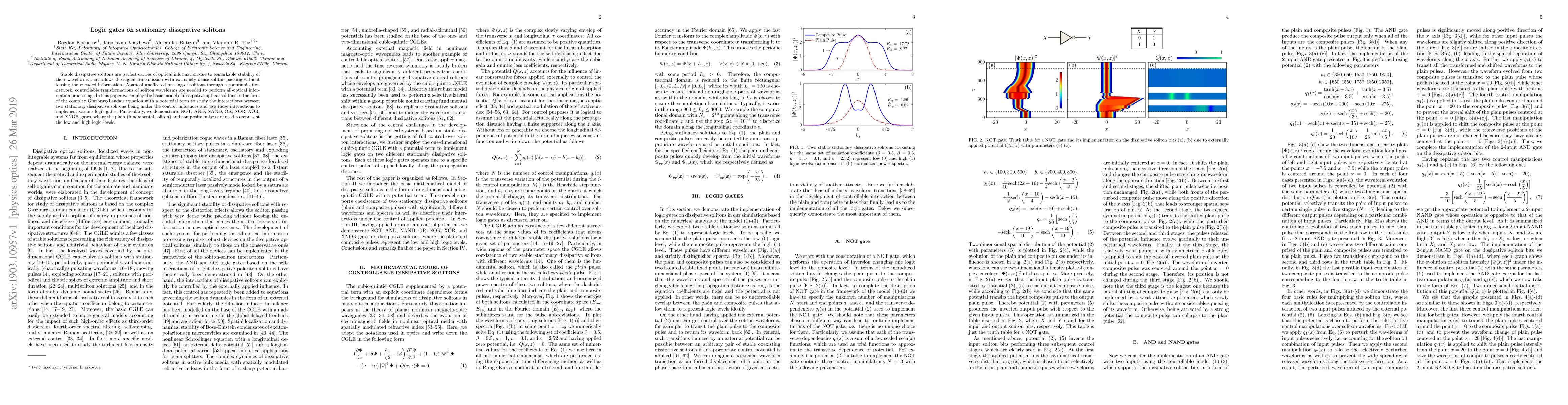This paper explores the use of stationary dissipative solitons in optical networks to implement logic gates, demonstrating NOT, AND, NAND, OR, NOR, XOR, and XNOR operations through controlled interactions between solitons, utilizing fundamental and composite pulses to represent logic levels.