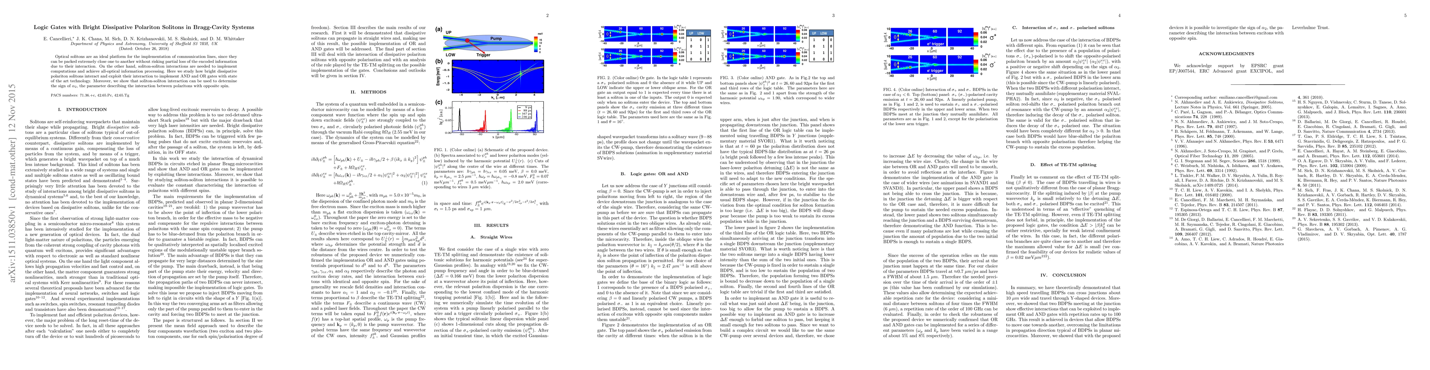 This paper investigates the interaction of bright dissipative polariton solitons in Bragg-cavity systems to implement logic gates for all-optical information processing. It demonstrates the feasibility of AND and OR gates using these solitons and determines the sign of the interaction parameter α2.