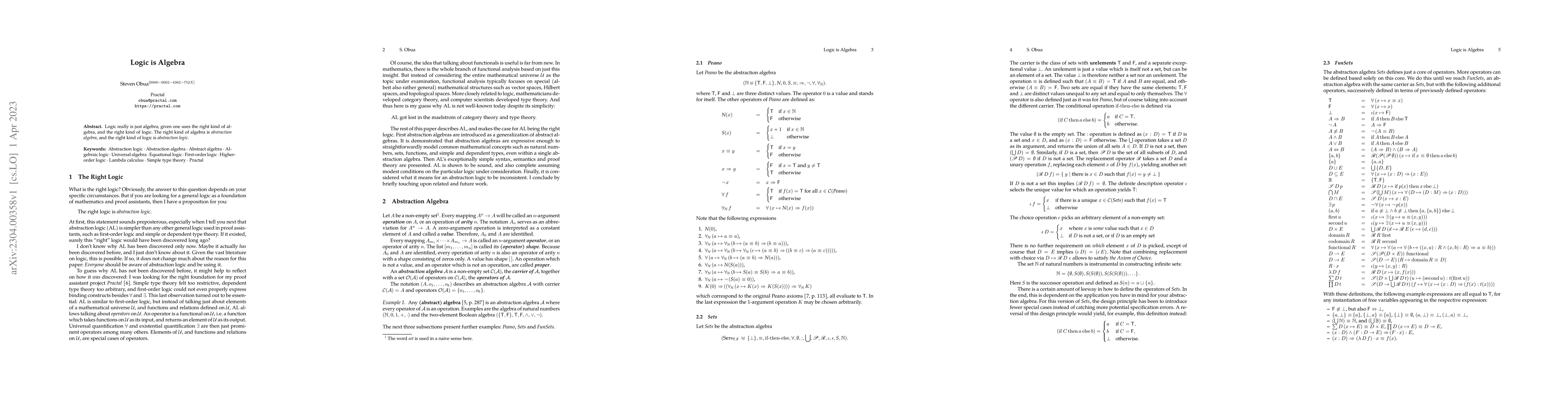 Summary: This paper argues that logic can be understood as a form of algebra, specifically abstraction algebra, and that abstraction logic provides the appropriate framework for this equivalence. The key is recognizing the structural similarities between logical operations and algebraic operations.