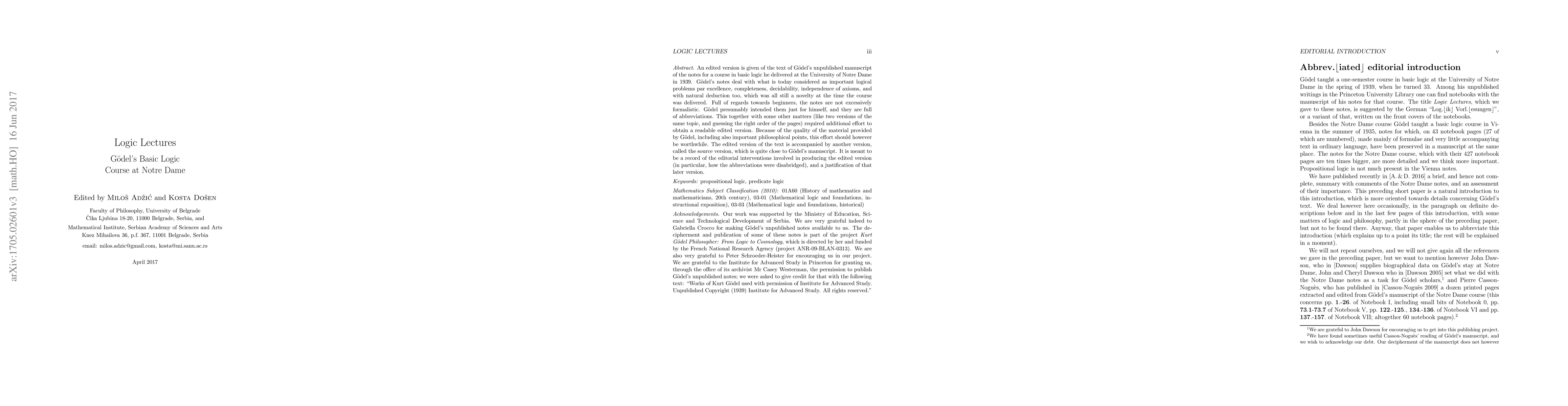 This paper presents an edited version of Gödel's unpublished 1939 Notre Dame logic course notes, focusing on foundational topics like completeness, decidability, and axiom independence, alongside natural deduction. The notes, initially informal and intended for personal use, have been meticulously revised to provide clarity and accessibility.
