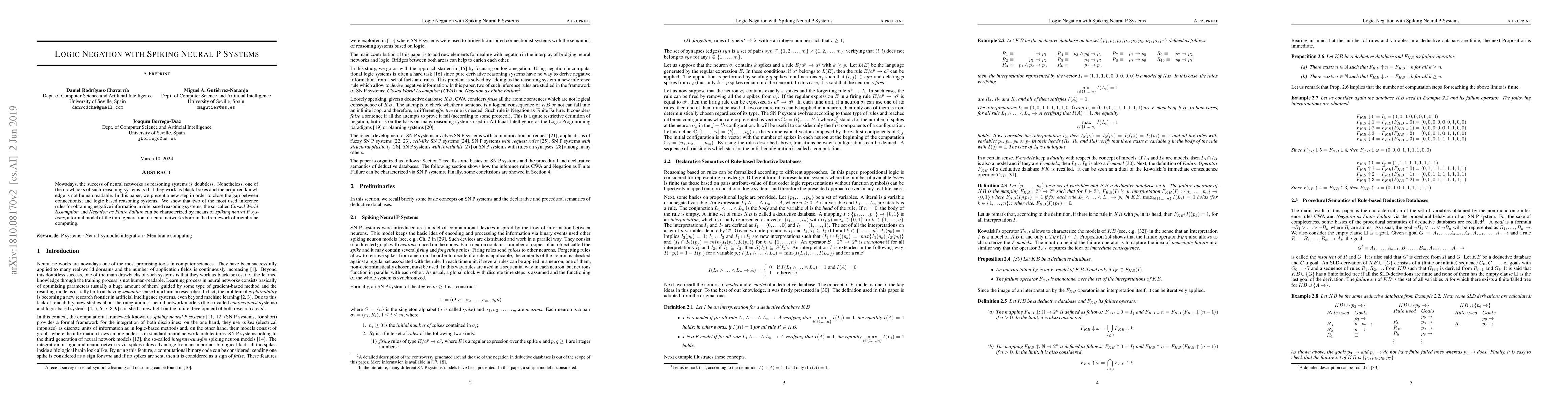 Nowadays, the success of neural networks as reasoning systems is doubtless. Nonetheless, one of the drawbacks of such reasoning systems is that they work as black-boxes and the acquired knowledge is not human readable. In this paper, we present a new step in order to close the gap between connectionist and logic based reasoning systems. We show that two of the most used inference rules for obtaining negative information in rule based reasoning systems, the so-called Closed World Assumption and Negation as Finite Failure can be characterized by means of spiking neural P systems, a formal model of the third generation of neural networks born in the framework of membrane computing.