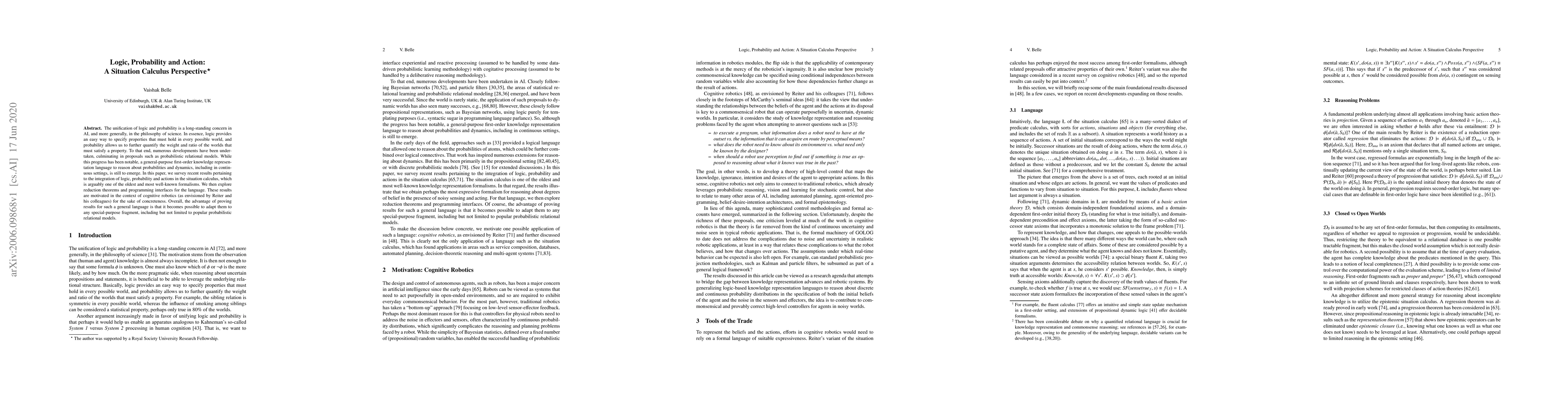 The unification of logic and probability is a long-standing concern in AI, and more generally, in the philosophy of science. In essence, logic provides an easy way to specify properties that must hold in every possible world, and probability allows us to further quantify the weight and ratio of the worlds that must satisfy a property. To that end, numerous developments have been undertaken, culminating in proposals such as probabilistic relational models. While this progress has been notable, a general-purpose first-order knowledge representation language to reason about probabilities and dynamics, including in continuous settings, is still to emerge. In this paper, we survey recent results pertaining to the integration of logic, probability and actions in the situation calculus, which is arguably one of the oldest and most well-known formalisms. We then explore reduction theorems and programming interfaces for the language. These results are motivated in the context of cognitive robotics (as envisioned by Reiter and his colleagues) for the sake of concreteness. Overall, the advantage of proving results for such a general language is that it becomes possible to adapt them to any special-purpose fragment, including but not limited to popular probabilistic relational models.