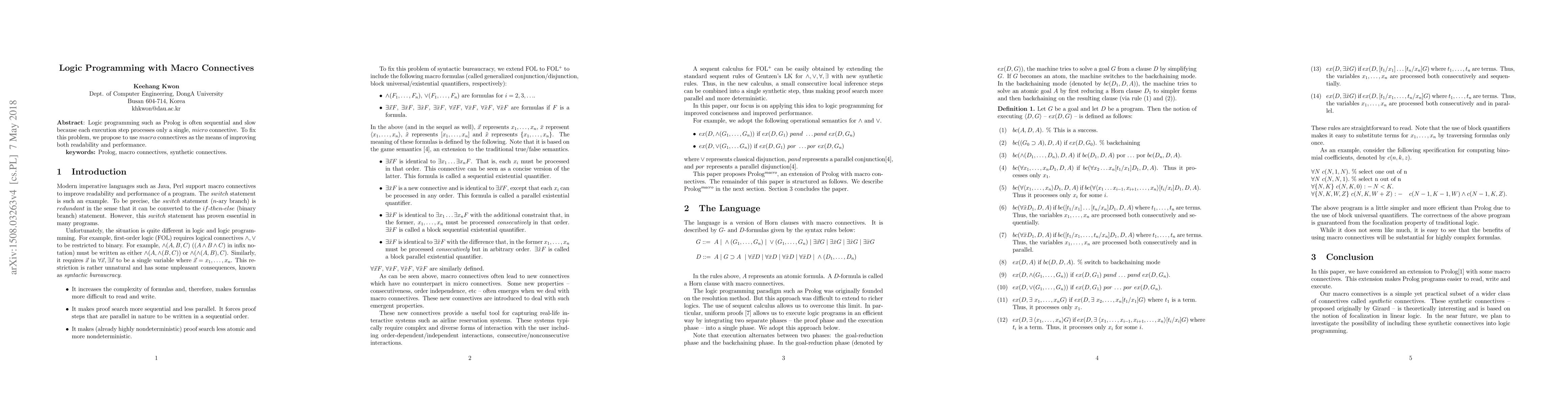 Researchers propose using macro connectives to improve readability and performance in logic programming, such as Prolog, by processing multiple connectives at once.