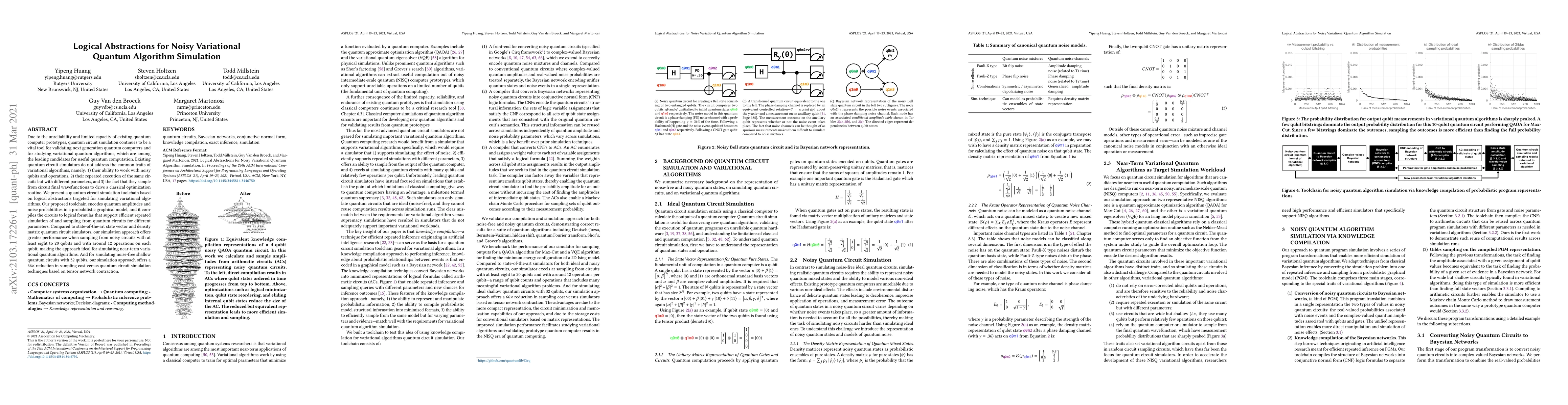 Due to the unreliability and limited capacity of existing quantum computer prototypes, quantum circuit simulation continues to be a vital tool for validating next generation quantum computers and for studying variational quantum algorithms, which are among the leading candidates for useful quantum computation. Existing quantum circuit simulators do not address the common traits of variational algorithms, namely: 1) their ability to work with noisy qubits and operations, 2) their repeated execution of the same circuits but with different parameters, and 3) the fact that they sample from circuit final wavefunctions to drive a classical optimization routine. We present a quantum circuit simulation toolchain based on logical abstractions targeted for simulating variational algorithms. Our proposed toolchain encodes quantum amplitudes and noise probabilities in a probabilistic graphical model, and it compiles the circuits to logical formulas that support efficient repeated simulation of and sampling from quantum circuits for different parameters. Compared to state-of-the-art state vector and density matrix quantum circuit simulators, our simulation approach offers greater performance when sampling from noisy circuits with at least eight to 20 qubits and with around 12 operations on each qubit, making the approach ideal for simulating near-term variational quantum algorithms. And for simulating noise-free shallow quantum circuits with 32 qubits, our simulation approach offers a $66\times$ reduction in sampling cost versus quantum circuit simulation techniques based on tensor network contraction.