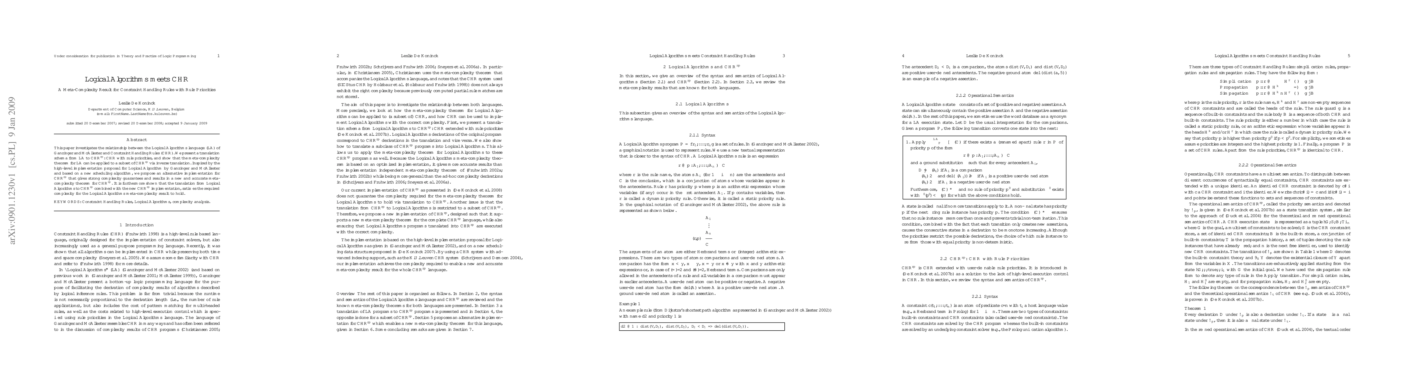 This research establishes a translation schema from Logical Algorithms (LA) to CHR-rp (Constraint Handling Rules with rule priorities), enabling the application of LA's meta-complexity theorem to a CHR-rp subset. A new scheduling algorithm and implementation for CHR-rp provide strong complexity guarantees, resulting in an accurate meta-complexity theorem for CHR-rp. The combined translation and new implementation satisfy complexity requirements for the LA meta-complexity result.