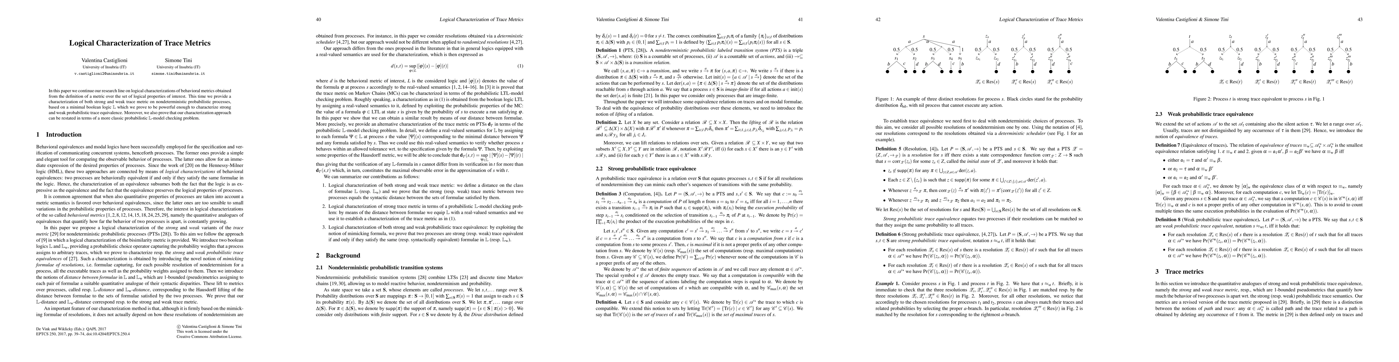 This paper characterizes strong and weak trace metrics for nondeterministic probabilistic processes using a minimal boolean logic L, proving its adequacy for probabilistic trace equivalence and linking it to a classic probabilistic L-model checking problem.