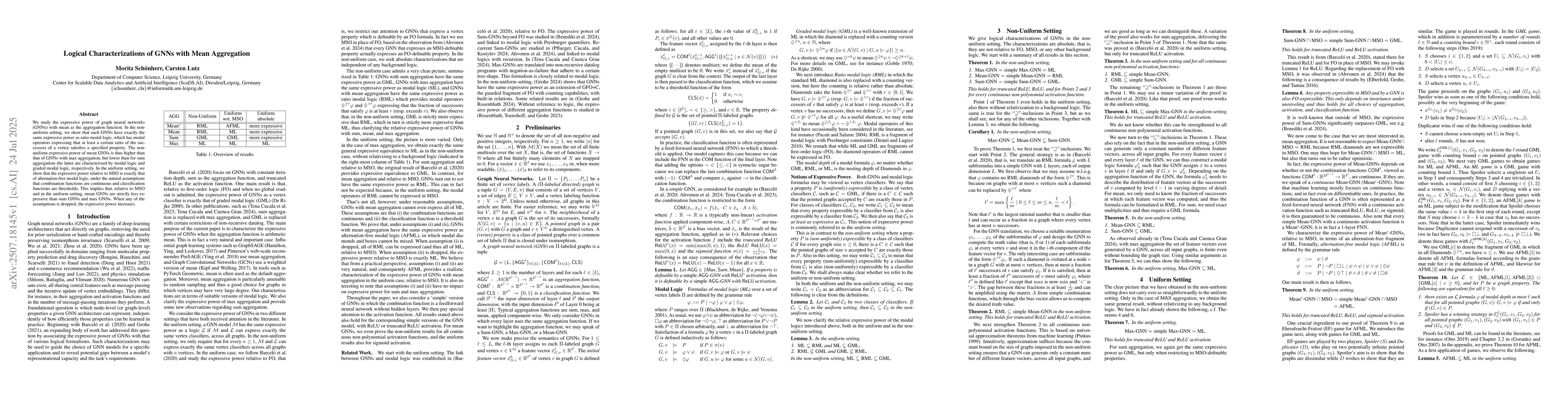 We study the expressive power of graph neural networks (GNNs) with mean as the aggregation function. In the non-uniform setting, we show that such GNNs have exactly the same expressive power as ratio modal logic, which has modal operators expressing that at least a certain ratio of the successors of a vertex satisfies a specified property. The non-uniform expressive power of mean GNNs is thus higher than that of GNNs with max aggregation, but lower than for sum aggregation--the latter are characterized by modal logic and graded modal logic, respectively. In the uniform setting, we show that the expressive power relative to MSO is exactly that of alternation-free modal logic, under the natural assumptions that combination functions are continuous and classification functions are thresholds. This implies that, relative to MSO and in the uniform setting, mean GNNs are strictly less expressive than sum GNNs and max GNNs. When any of the assumptions is dropped, the expressive power increases.