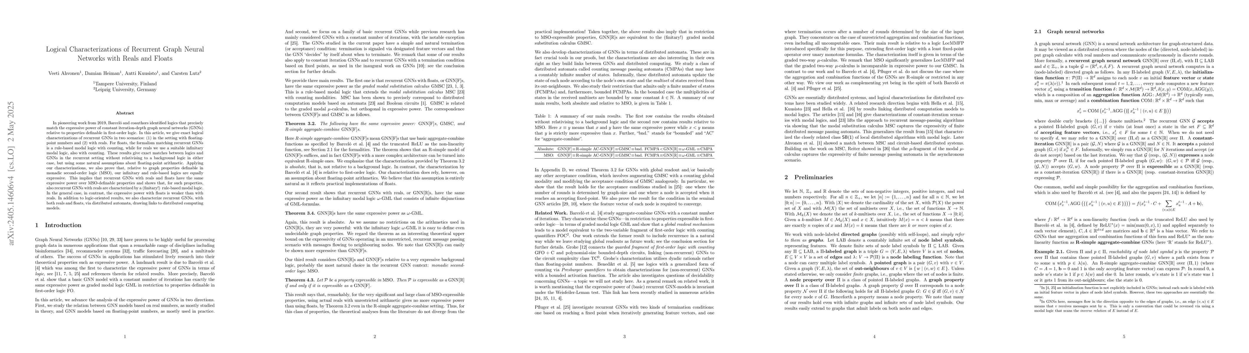 This paper characterizes the expressive power of recurrent Graph Neural Networks (GNNs) using logics in two settings: floating-point and real numbers. It establishes that recurrent GNNs with floating-point numbers are matched by a rule-based modal logic with counting, while those with real numbers align with an infinitary modal logic. Both logics show equal expressive power relative to graph properties defined in monadic second-order logic, indicating that recurrent GNNs with either floats or reals have the same expressive capability for these properties.