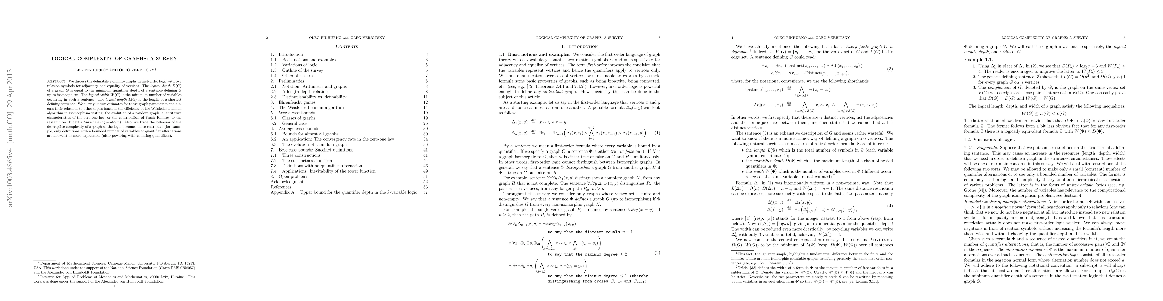 We discuss the definability of finite graphs in first-order logic with two relation symbols for adjacency and equality of vertices. The logical depth $D(G)$ of a graph $G$ is equal to the minimum quantifier depth of a sentence defining $G$ up to isomorphism. The logical width $W(G)$ is the minimum number of variables occurring in such a sentence. The logical length $L(G)$ is the length of a shortest defining sentence. We survey known estimates for these graph parameters and discuss their relations to other topics (such as the efficiency of the Weisfeiler-Lehman algorithm in isomorphism testing, the evolution of a random graph, quantitative characteristics of the zero-one law, or the contribution of Frank Ramsey to the research on Hilbert's Entscheidungsproblem). Also, we trace the behavior of the descriptive complexity of a graph as the logic becomes more restrictive (for example, only definitions with a bounded number of variables or quantifier alternations are allowed) or more expressible (after powering with counting quantifiers).