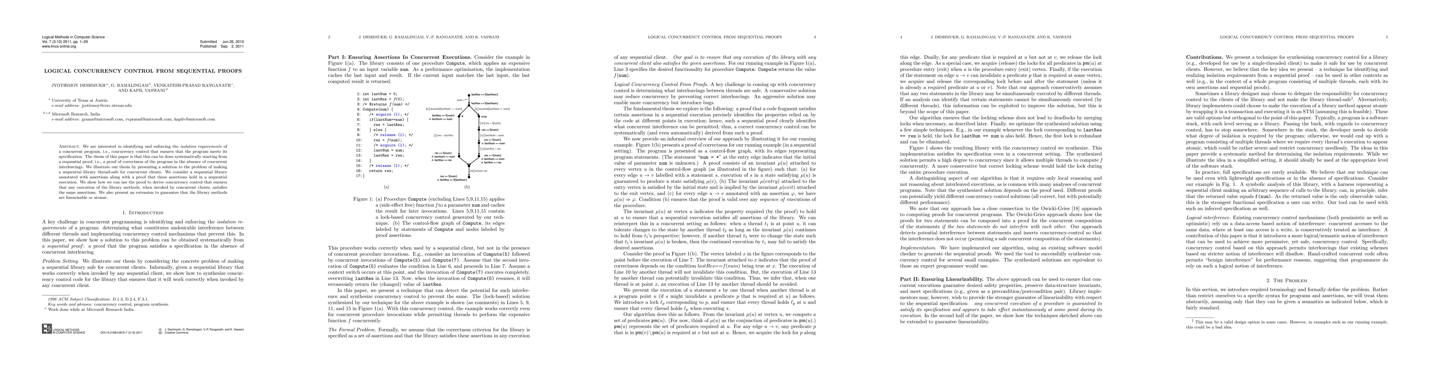 This paper proposes a method to enforce concurrency control in concurrent programs by systematically deriving it from sequential proofs. It demonstrates how to make a sequentially proven library thread-safe and linearizable for concurrent clients using the original proof's assertions.