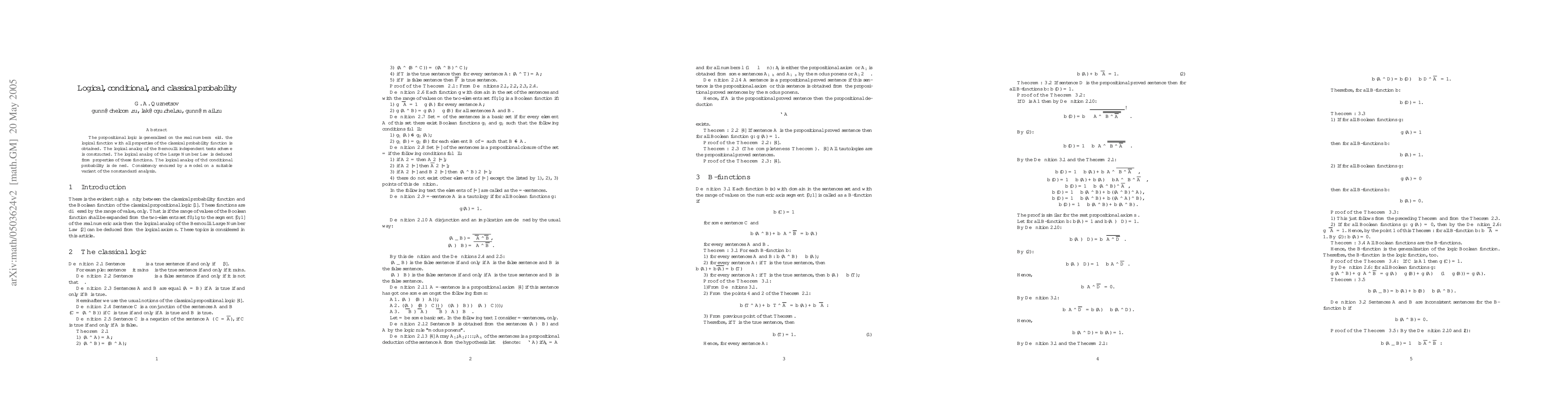 The propositional logic is generalized on the real numbers field. the logical function with all properties of the classical probability function is obtained. The logical analog of the Bernoulli independent tests scheme is constructed. The logical analog of the Large Number Law is deduced from properties of these functions. The logical analog of thd conditional probability is defined. Consistency encured by a model on a suitable variant of the nonstandard analysis.