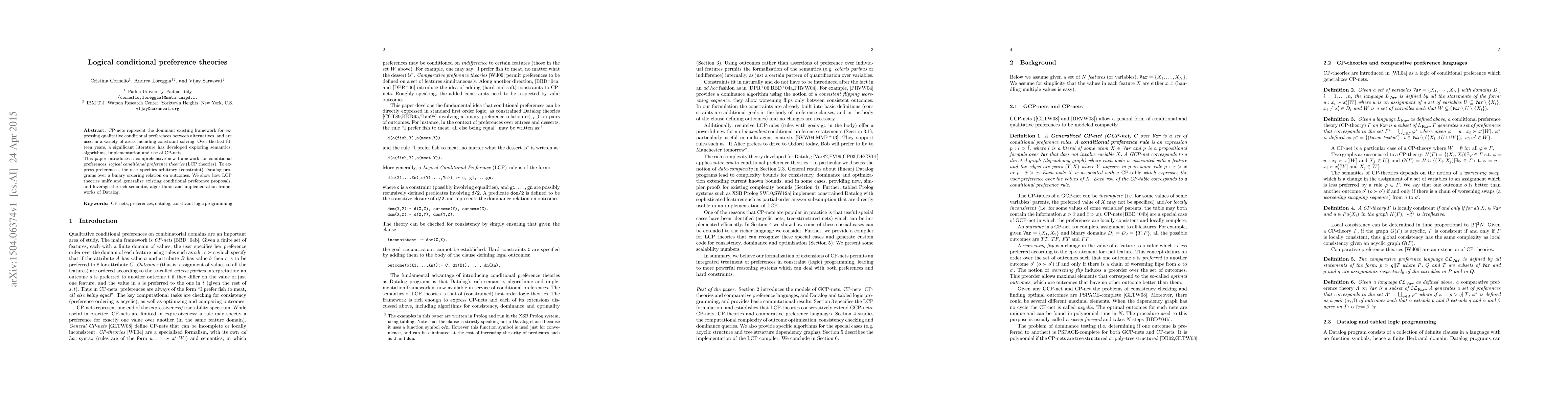 This paper introduces logical conditional preference theories (LCP theories), a new framework for expressing qualitative conditional preferences using Datalog programs. LCP theories unify and generalize existing CP-nets and leverage the robust frameworks of Datalog for semantics, algorithms, and implementation.