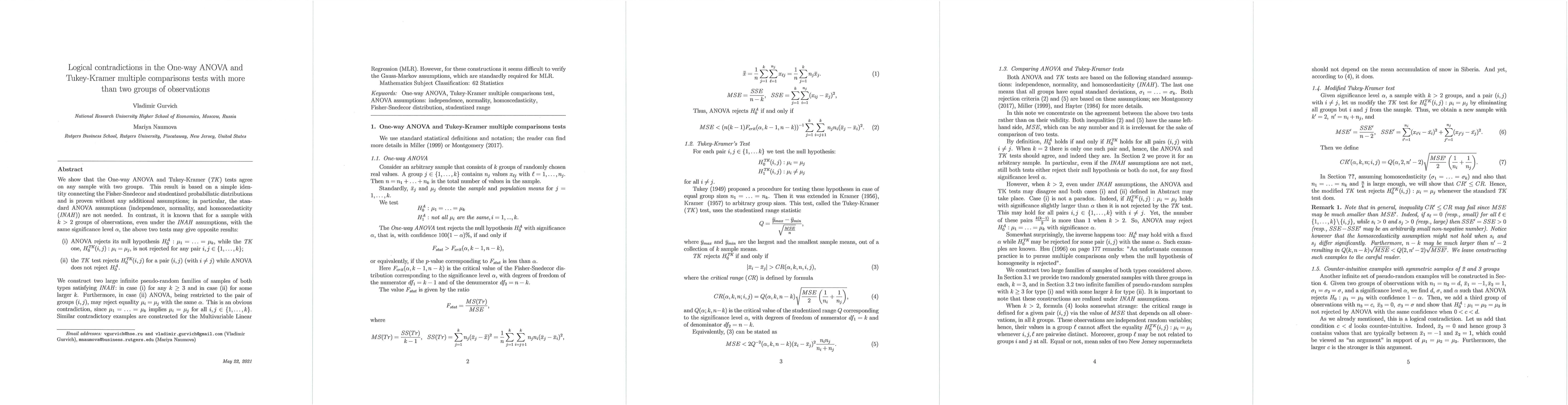 We show that the One-way ANOVA and Tukey-Kramer (TK) tests agree on any sample with two groups. This result is based on a simple identity connecting the Fisher-Snedecor and studentized probabilistic distributions and is proven without any additional assumptions; in particular, the standard ANOVA assumptions (independence, normality, and homoscedasticity (INAH)) are not needed. In contrast, it is known that for a sample with k > 2 groups of observations, even under the INAH assumptions, with the same significance level $\alpha$, the above two tests may give opposite results: (i) ANOVA rejects its null hypothesis $H_0^{A}: \mu_1 = \ldots = \mu_k$, while the TK one, $H_0^{TK}(i,j): \mu_i = \mu_j$, is not rejected for any pair $i, j \in \{1, \ldots, k\}$; (ii) the TK test rejects $H_0^{TK}(i,j)$ for a pair $(i, j)$ (with $i \neq j$) while ANOVA does not reject $H_0^{A}$. We construct two large infinite pseudo-random families of samples of both types satisfying INAH: in case (i) for any $k \geq 3$ and in case (ii) for some larger $k$. Furthermore, in case (ii) ANOVA, being restricted to the pair of groups $(i,j)$, may reject equality $\mu_i = \mu_j$ with the same $\alpha$. This is an obvious contradiction, since $\mu_1 = \ldots = \mu_k$ implies $\mu_i = \mu_j$ for all $i, j \in \{1, \ldots, k\}.$ Similar contradictory examples are constructed for the Multivariable Linear Regression (MLR). However, for these constructions it seems difficult to verify the Gauss-Markov assumptions, which are standardly required for MLR.