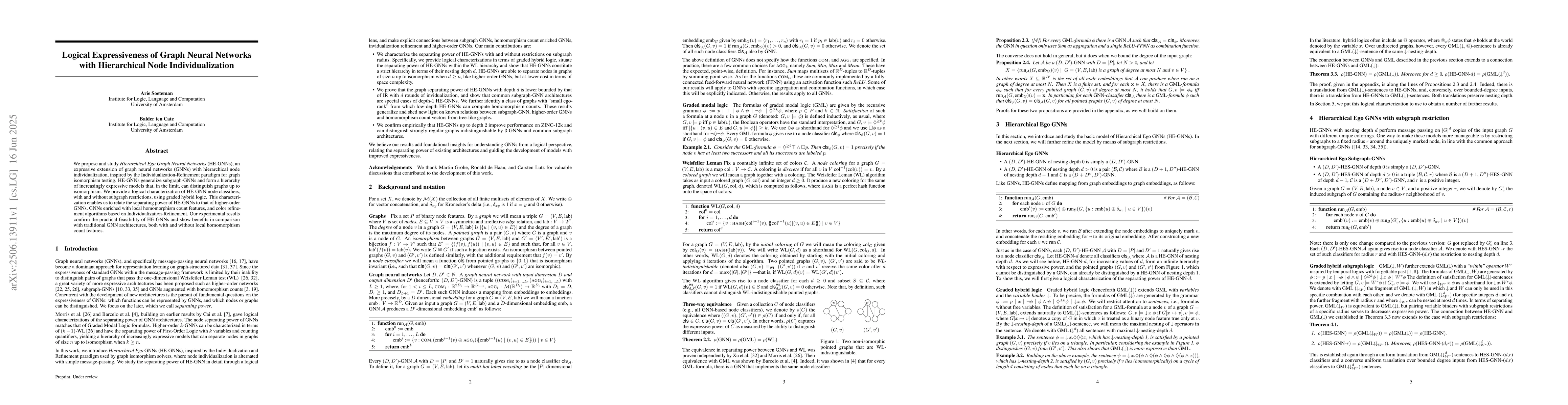 The paper introduces Hierarchical Ego Graph Neural Networks (HEGNNs), an expressive GNN extension with hierarchical node individualization. HEGNNs can distinguish graphs up to isomorphism, surpassing traditional GNNs, and are logically characterized using graded hybrid logic. Experiments show HEGNNs outperform standard GNNs with and without local homomorphism count features.