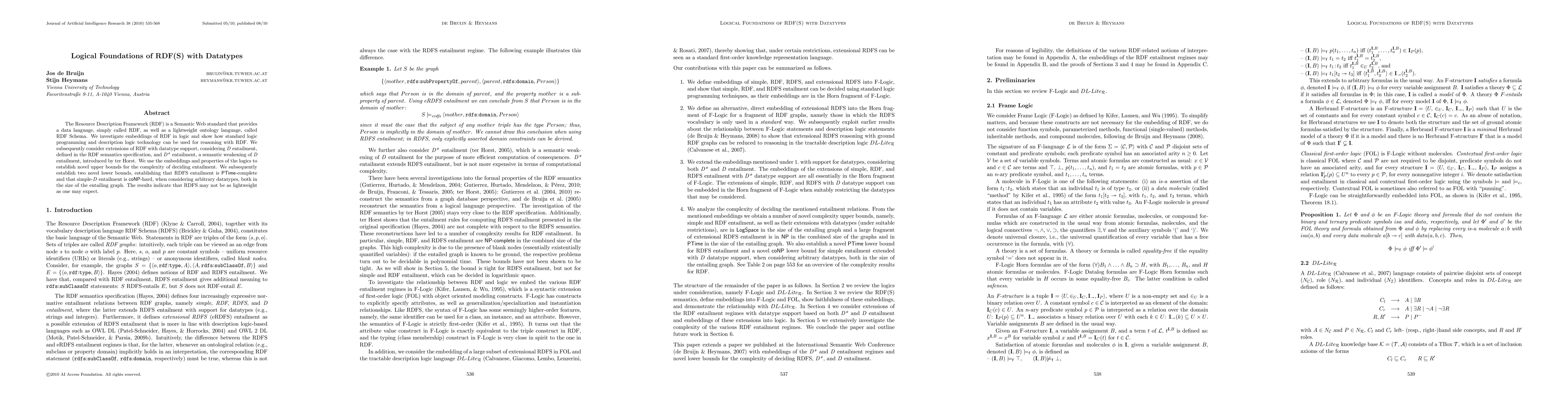The paper presents logical embeddings for RDF(S) with datatypes, linking RDF to logic programming and description logics, and provides complexity analyses for entailment.