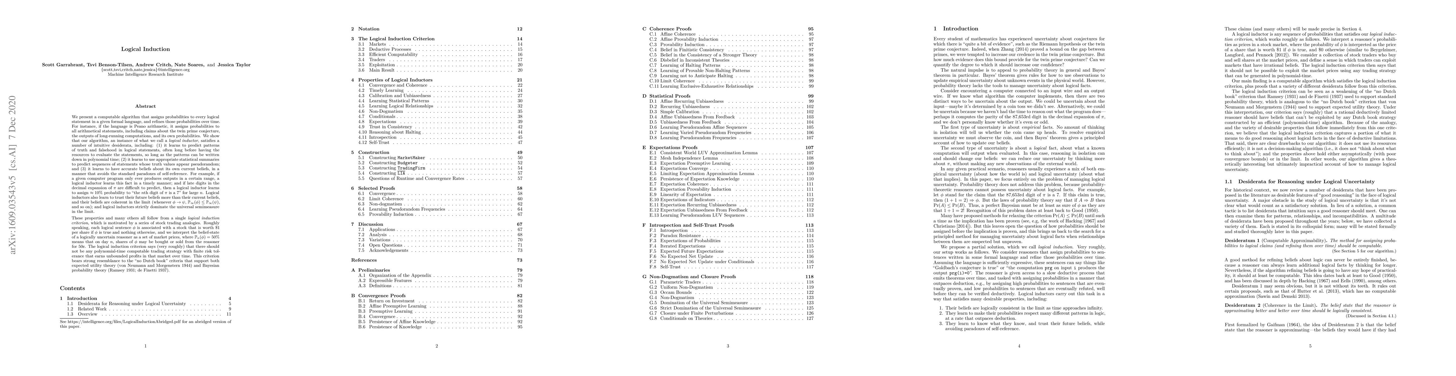 We present a computable algorithm that assigns probabilities to every logical statement in a given formal language, and refines those probabilities over time. For instance, if the language is Peano arithmetic, it assigns probabilities to all arithmetical statements, including claims about the twin prime conjecture, the outputs of long-running computations, and its own probabilities. We show that our algorithm, an instance of what we call a logical inductor, satisfies a number of intuitive desiderata, including: (1) it learns to predict patterns of truth and falsehood in logical statements, often long before having the resources to evaluate the statements, so long as the patterns can be written down in polynomial time; (2) it learns to use appropriate statistical summaries to predict sequences of statements whose truth values appear pseudorandom; and (3) it learns to have accurate beliefs about its own current beliefs, in a manner that avoids the standard paradoxes of self-reference. For example, if a given computer program only ever produces outputs in a certain range, a logical inductor learns this fact in a timely manner; and if late digits in the decimal expansion of $\pi$ are difficult to predict, then a logical inductor learns to assign $\approx 10\%$ probability to "the $n$th digit of $\pi$ is a 7" for large $n$. Logical inductors also learn to trust their future beliefs more than their current beliefs, and their beliefs are coherent in the limit (whenever $\phi \implies \psi$, $\mathbb{P}_\infty(\phi) \le \mathbb{P}_\infty(\psi)$, and so on); and logical inductors strictly dominate the universal semimeasure in the limit. These properties and many others all follow from a single logical induction criterion, which is motivated by a series of stock trading analogies. Roughly speaking, each logical sentence $\phi$ is associated with a stock that is worth \$1 per share if [...]