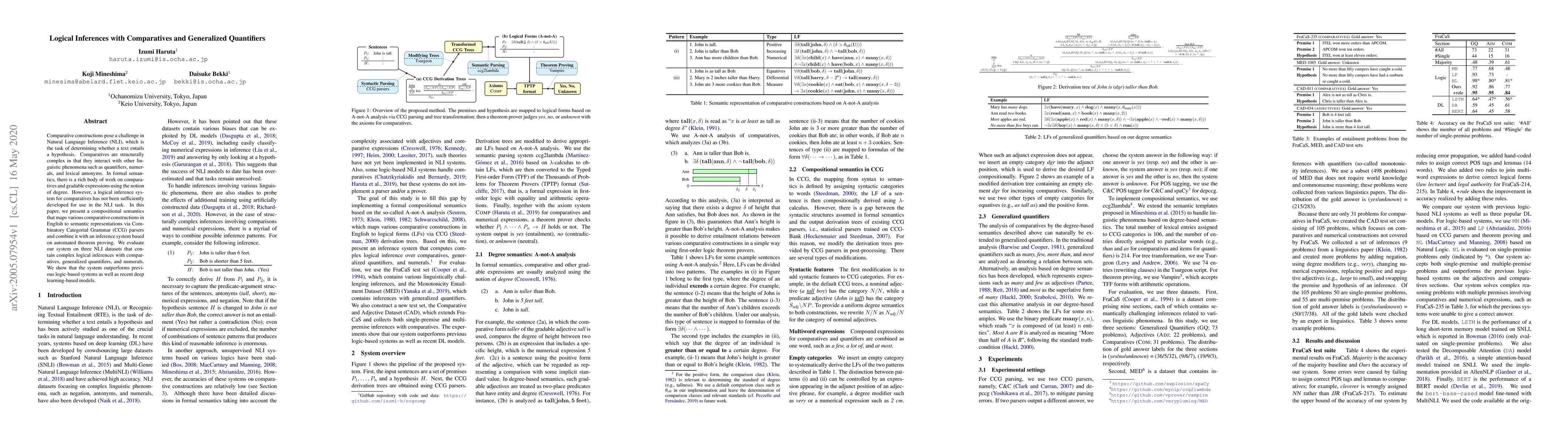 This paper develops a compositional semantics framework using Combinatory Categorial Grammar to translate comparative constructions into semantic representations, integrating it with an automated theorem proving inference system for Natural Language Inference. The proposed system outperforms both logic-based and deep learning-based models on datasets requiring complex logical inferences with comparatives and generalized quantifiers.