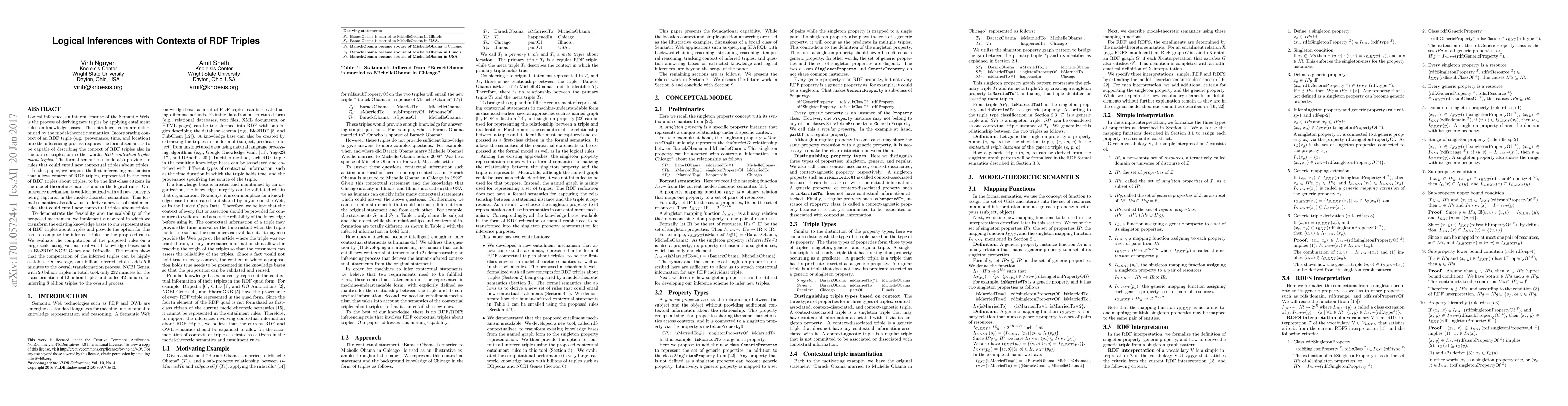 This paper proposes a novel inferencing mechanism for RDF triples that incorporates contextual information, represented as RDF triples about triples, into the model-theoretic semantics. The authors demonstrate the scalability of their approach by implementing a tool that transforms and infers contextual triples from large-scale knowledge bases, showing efficient computation even with billions of inferred triples.
