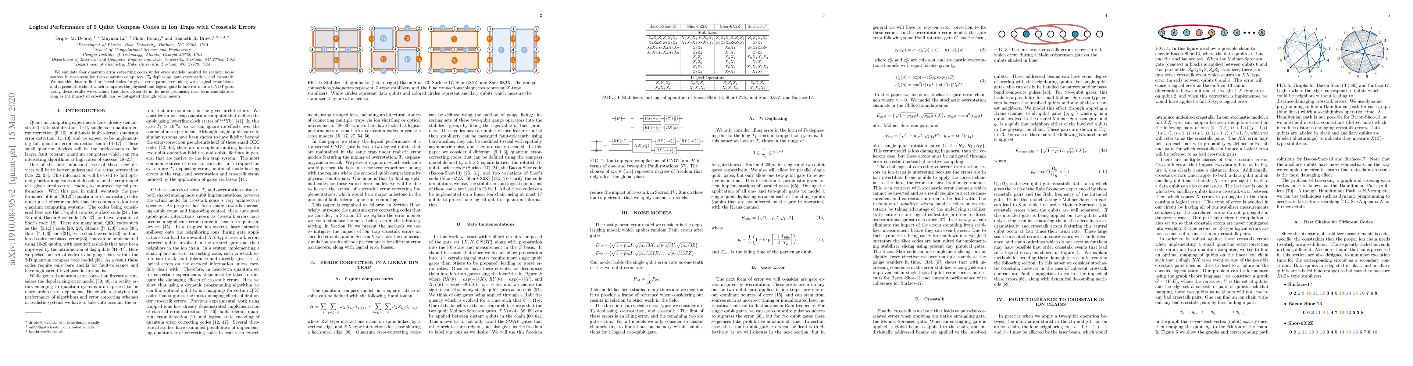 Researchers found that the Bacon-Shor-13 quantum error-correcting code is a promising candidate for near-term ion trap quantum computers due to its resilience against common errors like crosstalk, dephasing, and gate overrotation. The study suggests mitigating crosstalk's impact through other means makes it an ideal choice.
