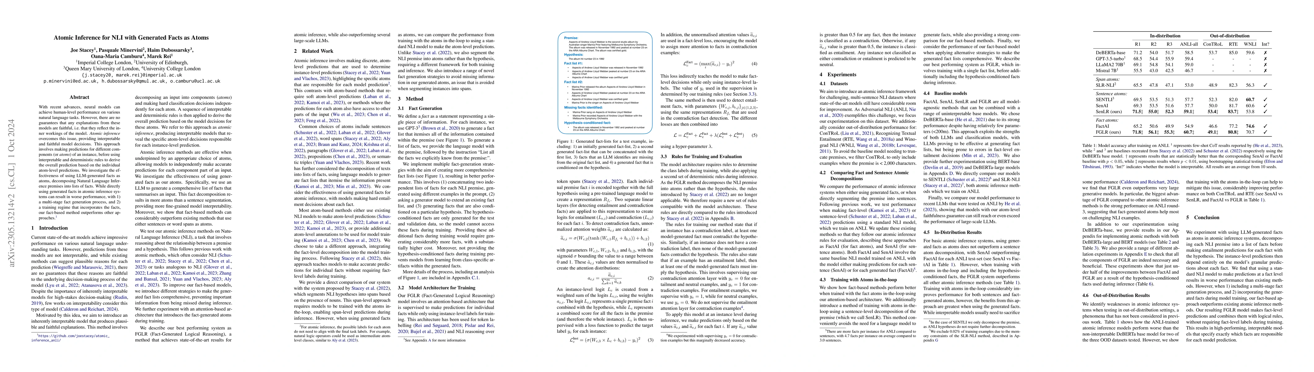 State-of-the-art neural models can now reach human performance levels across various natural language understanding tasks. However, despite this impressive performance, models are known to learn from annotation artefacts at the expense of the underlying task. While interpretability methods can identify influential features for each prediction, there are no guarantees that these features are responsible for the model decisions. Instead, we introduce a model-agnostic logical framework to determine the specific information in an input responsible for each model decision. This method creates interpretable Natural Language Inference (NLI) models that maintain their predictive power. We achieve this by generating facts that decompose complex NLI observations into individual logical atoms. Our model makes predictions for each atom and uses logical rules to decide the class of the observation based on the predictions for each atom. We apply our method to the highly challenging ANLI dataset, where our framework improves the performance of both a DeBERTa-base and BERT baseline. Our method performs best on the most challenging examples, achieving a new state-of-the-art for the ANLI round 3 test set. We outperform every baseline in a reduced-data setting, and despite using no annotations for the generated facts, our model predictions for individual facts align with human expectations.