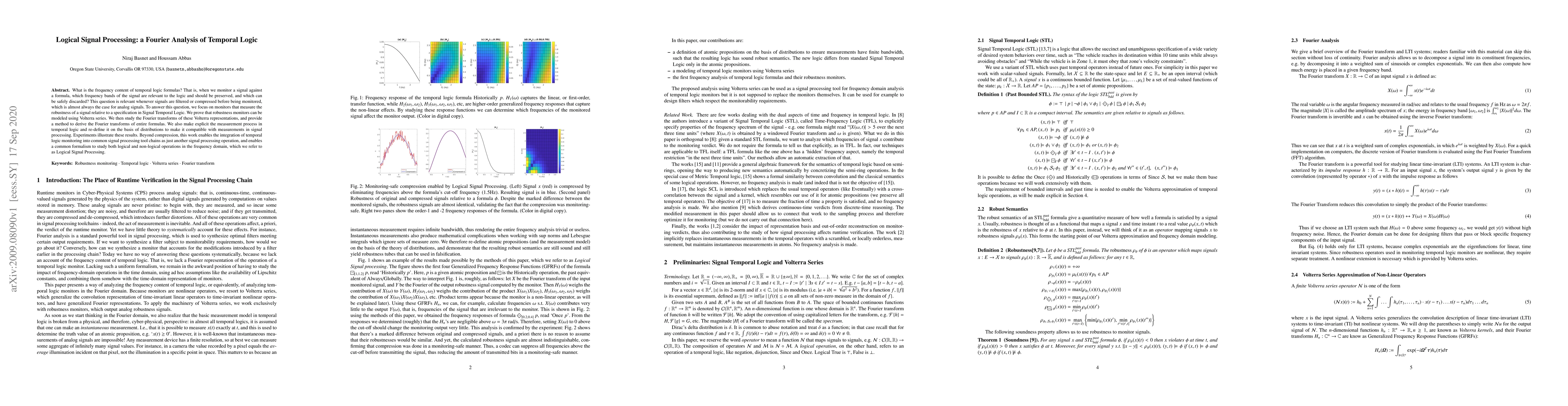 What is the frequency content of temporal logic formulas? That is, when we monitor a signal against a formula, which frequency bands of the signal are relevant to the logic and should be preserved, and which can be safely discarded? This question is relevant whenever signals are filtered or compressed before being monitored, which is almost always the case for analog signals. To answer this question, we focus on monitors that measure the robustness of a signal relative to a specification in Signal Temporal Logic. We prove that robustness monitors can be modeled using Volterra series. We then study the Fourier transforms of these Volterra representations, and provide a method to derive the Fourier transforms of entire formulas. We also make explicit the measurement process in temporal logic and re-define it on the basis of distributions to make it compatible with measurements in signal processing. Experiments illustrate these results. Beyond compression, this work enables the integration of temporal logic monitoring into common signal processing toolchains as just another signal processing operation, and enables a common formalism to study both logical and non-logical operations in the frequency domain, which we refer to as Logical Signal Processing.