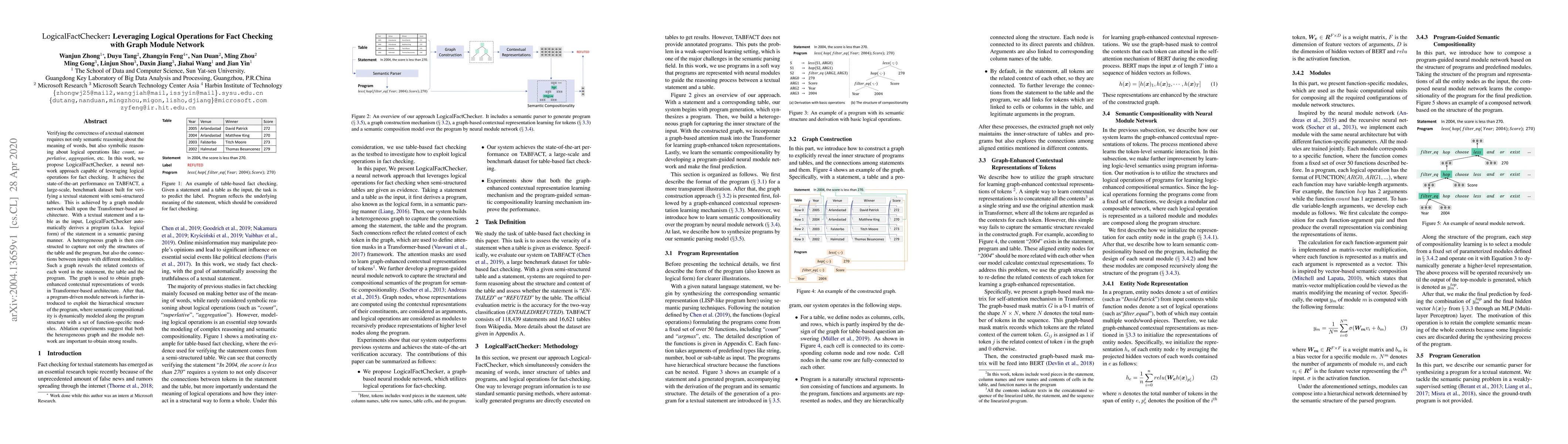 LogicalFactChecker utilizes logical operations and a graph module network to achieve state-of-the-art performance in fact checking by transforming textual statements into logical forms and enhancing contextual representations through a heterogeneous graph. The model dynamically models semantic compositionality using a program-driven module network.
