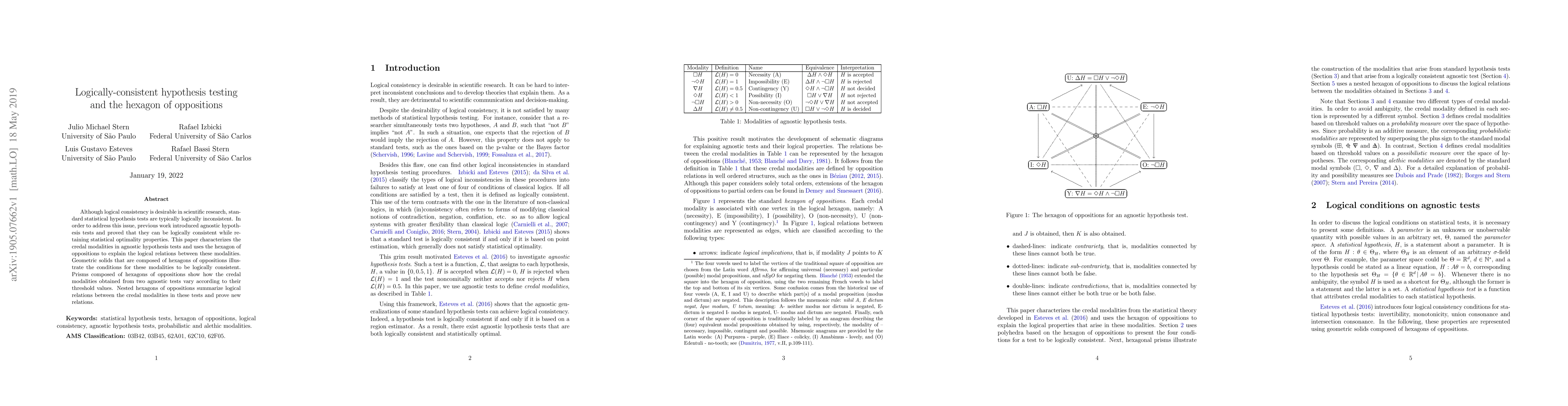 Although logical consistency is desirable in scientific research, standard statistical hypothesis tests are typically logically inconsistent. In order to address this issue, previous work introduced agnostic hypothesis tests and proved that they can be logically consistent while retaining statistical optimality properties. This paper characterizes the credal modalities in agnostic hypothesis tests and uses the hexagon of oppositions to explain the logical relations between these modalities. Geometric solids that are composed of hexagons of oppositions illustrate the conditions for these modalities to be logically consistent. Prisms composed of hexagons of oppositions show how the credal modalities obtained from two agnostic tests vary according to their threshold values. Nested hexagons of oppositions summarize logical relations between the credal modalities in these tests and prove new relations.