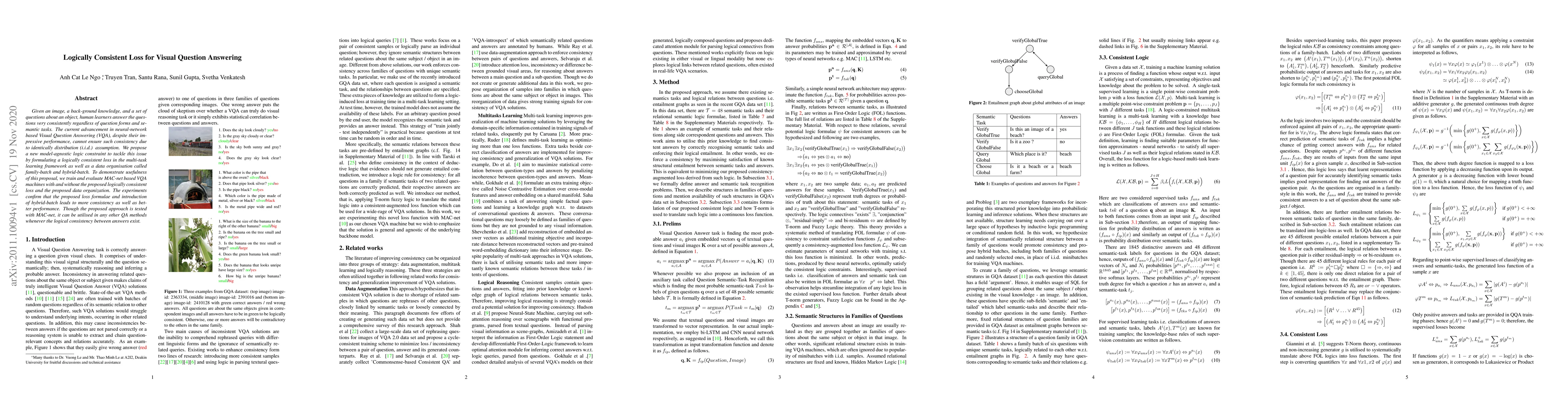 Given an image, a back-ground knowledge, and a set of questions about an object, human learners answer the questions very consistently regardless of question forms and semantic tasks. The current advancement in neural-network based Visual Question Answering (VQA), despite their impressive performance, cannot ensure such consistency due to identically distribution (i.i.d.) assumption. We propose a new model-agnostic logic constraint to tackle this issue by formulating a logically consistent loss in the multi-task learning framework as well as a data organisation called family-batch and hybrid-batch. To demonstrate usefulness of this proposal, we train and evaluate MAC-net based VQA machines with and without the proposed logically consistent loss and the proposed data organization. The experiments confirm that the proposed loss formulae and introduction of hybrid-batch leads to more consistency as well as better performance. Though the proposed approach is tested with MAC-net, it can be utilised in any other QA methods whenever the logical consistency between answers exist.