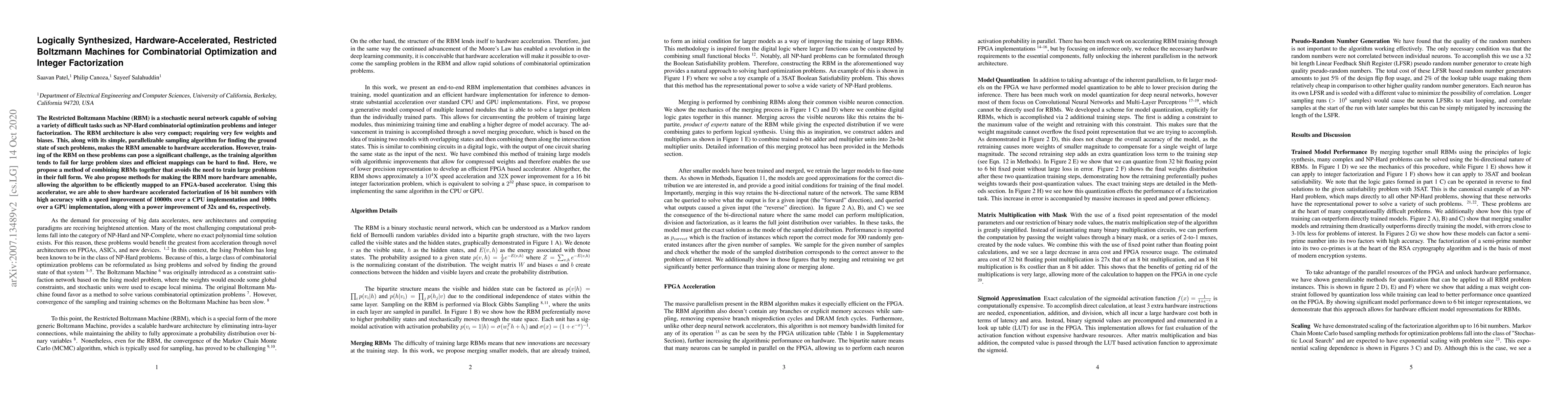 This paper proposes a logically synthesized, hardware-accelerated approach to using Restricted Boltzmann Machines (RBMs) for combinatorial optimization and integer factorization. The method combines RBMs to avoid training large problems and enhances hardware efficiency, achieving a 10,000x speed and 32x power improvement in FPGA-based factorization of 16-bit numbers.