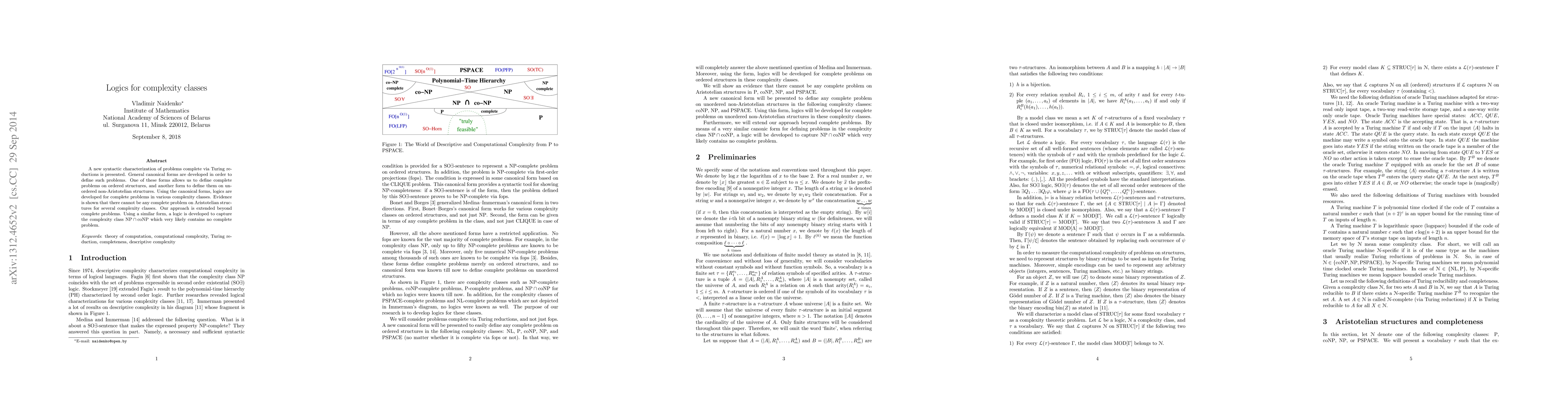 A new syntactic characterization of problems complete via Turing reductions is presented. General canonical forms are developed in order to define such problems. One of these forms allows us to define complete problems on ordered structures, and another form to define them on unordered non-Aristotelian structures. Using the canonical forms, logics are developed for complete problems in various complexity classes. Evidence is shown that there cannot be any complete problem on Aristotelian structures for several complexity classes. Our approach is extended beyond complete problems. Using a similar form, a logic is developed to capture the complexity class $NP\cap coNP$ which very likely contains no complete problem.