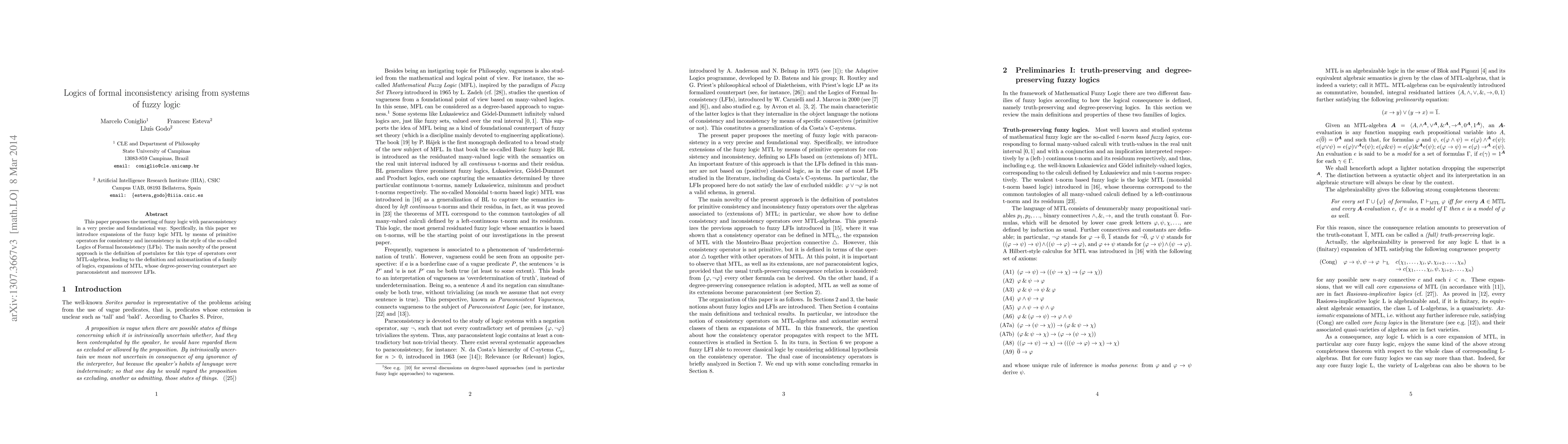 This paper introduces expansions of MTL fuzzy logic using primitive operators for consistency and inconsistency, defining a family of paraconsistent Logics of Formal Inconsistency (LFIs) over MTL-algebras through novel postulates.