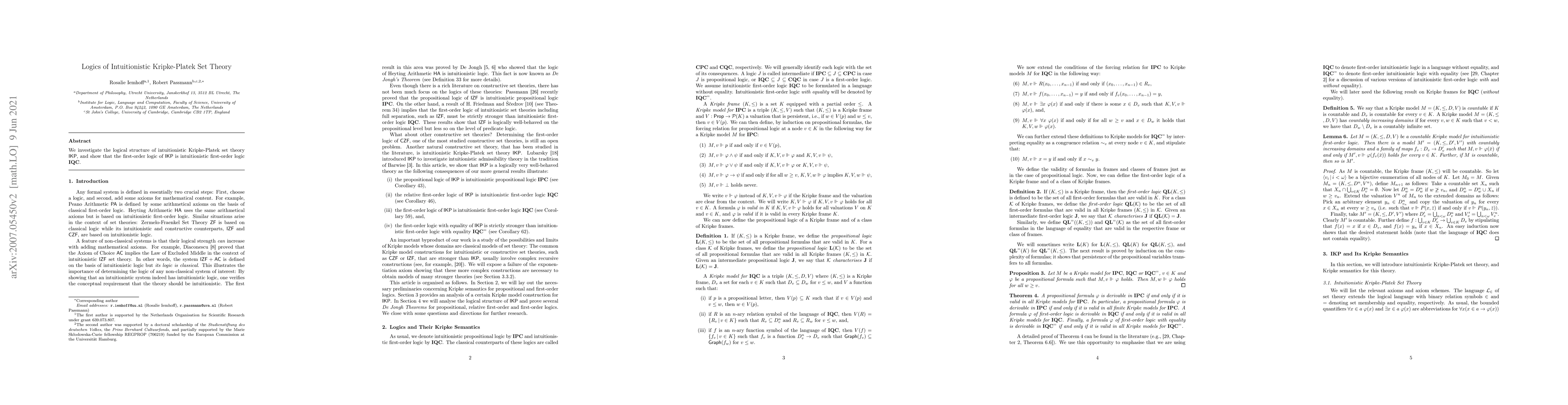 This paper explores the logical framework of intuitionistic Kripke-Platek set theory (IKP) and demonstrates that its first-order logic aligns with intuitionistic first-order logic (IQC).