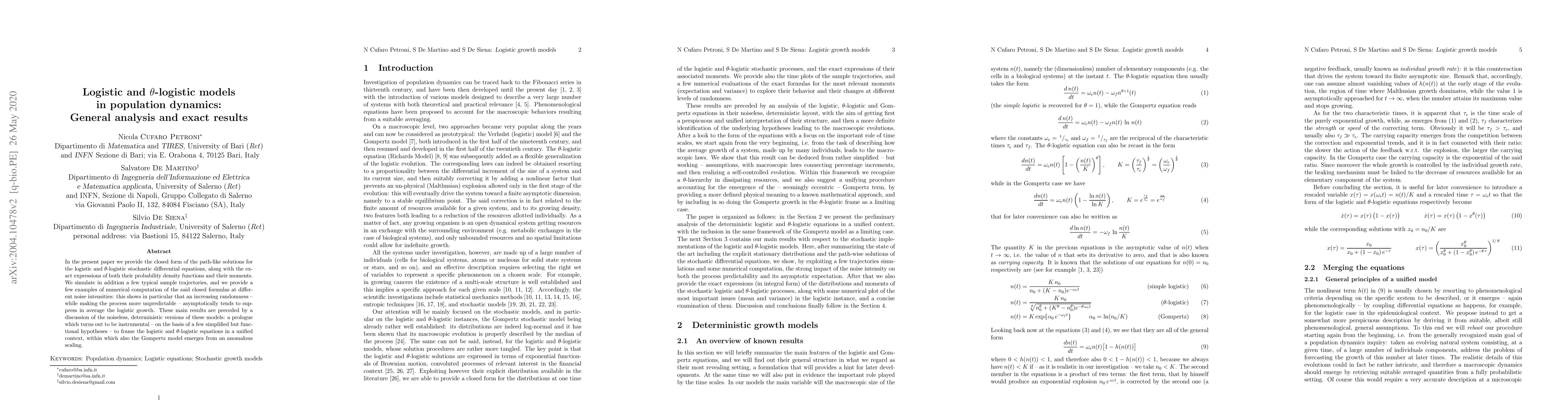 Researchers analyzed logistic and $ heta$-logistic models in population dynamics, finding closed-form solutions for path-like solutions, probability density functions, and moments, with simulations showing that increasing randomness tends to suppress average growth.