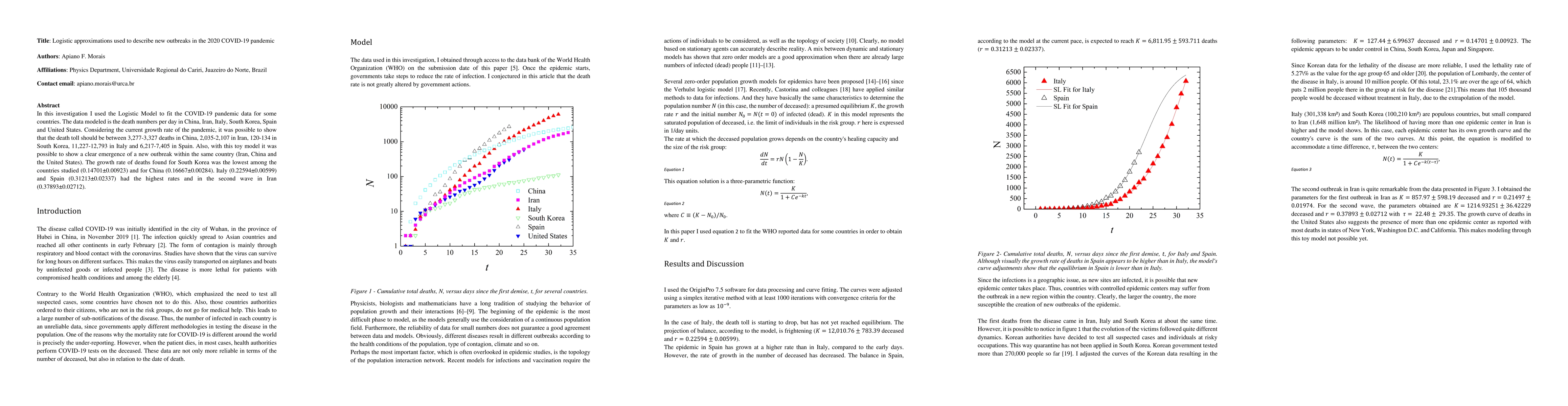 In this investigation I used the Logistic Model to fit the COVID-19 pandemic data for some countries. The data modeled is the death numbers per day in China, Iran, Italy, South Korea, Spain and United States. Considering the current growth rate of the pandemic, it was possible to show that the death toll should be between 3,277-3,327 deaths in China, 2,035-2,107 in Iran, 120-134 in South Korea, 11,227-12,793 in Italy and 6,217-7,405 in Spain. Also, with this toy model it was possible to show a clear emergence of a new outbreak within the same country (Iran, China and the United States). The growth rate of deaths found for South Korea was the lowest among the countries studied ($0.14701\pm0.00923$) and for China ($0.16667\pm0.00284$). Italy ($0.22594\pm0.00599$) and Spain ($0.31213\pm0.02337$) had the highest rates and in the second wave in Iran ($0.37893\pm0.02712$).