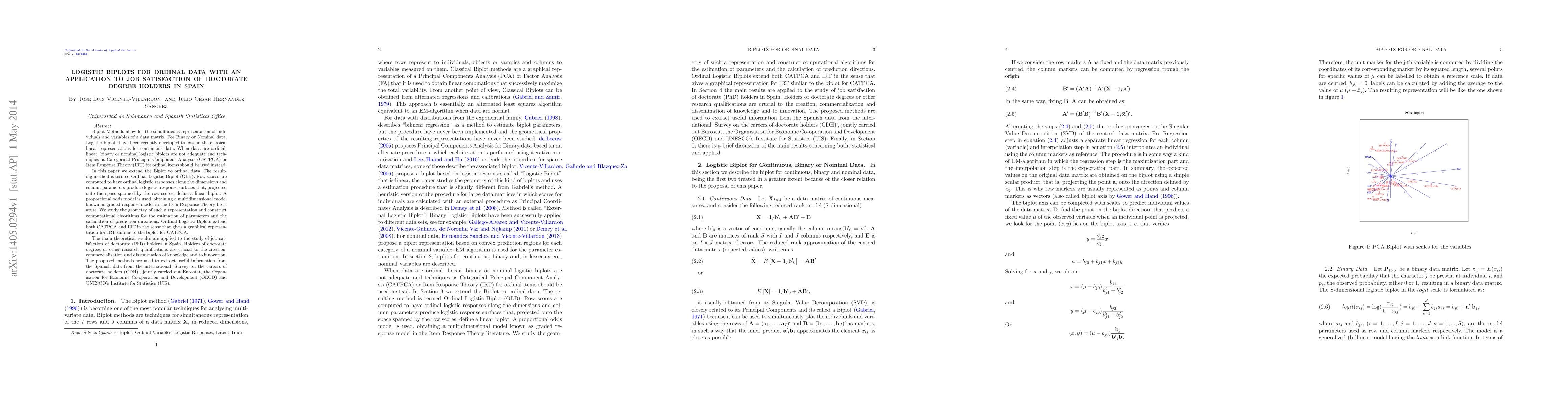 This paper introduces the Ordinal Logistic Biplot (OLB) method for representing ordinal data, extending biplot techniques to accommodate ordinal logistic responses. The OLB method uses a graded response model to provide a graphical representation akin to biplots for categorical data, and is applied to analyze job satisfaction among doctorate degree holders in Spain using international survey data.