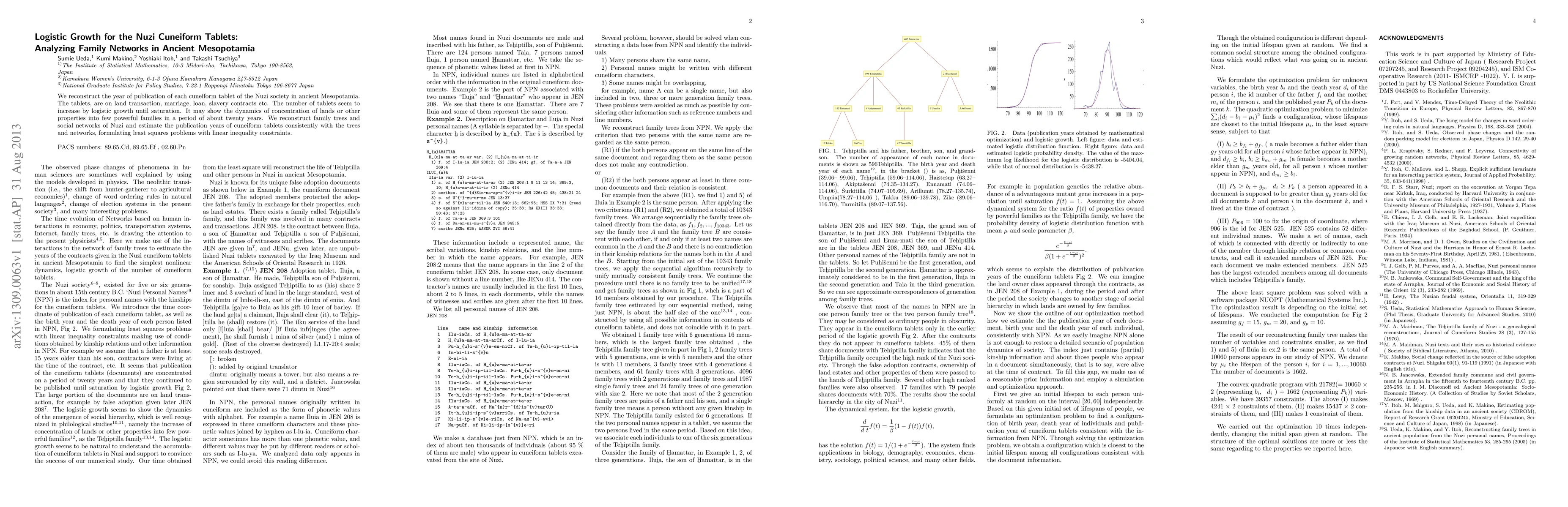 This study analyzes the logistic growth pattern in the publication of Nuzi cuneiform tablets, revealing a concentration of land and property transactions among powerful families in ancient Mesopotamia. The research reconstructs family trees and social networks, aligning tablet publication years with these structures using least squares problems with linear inequality constraints.