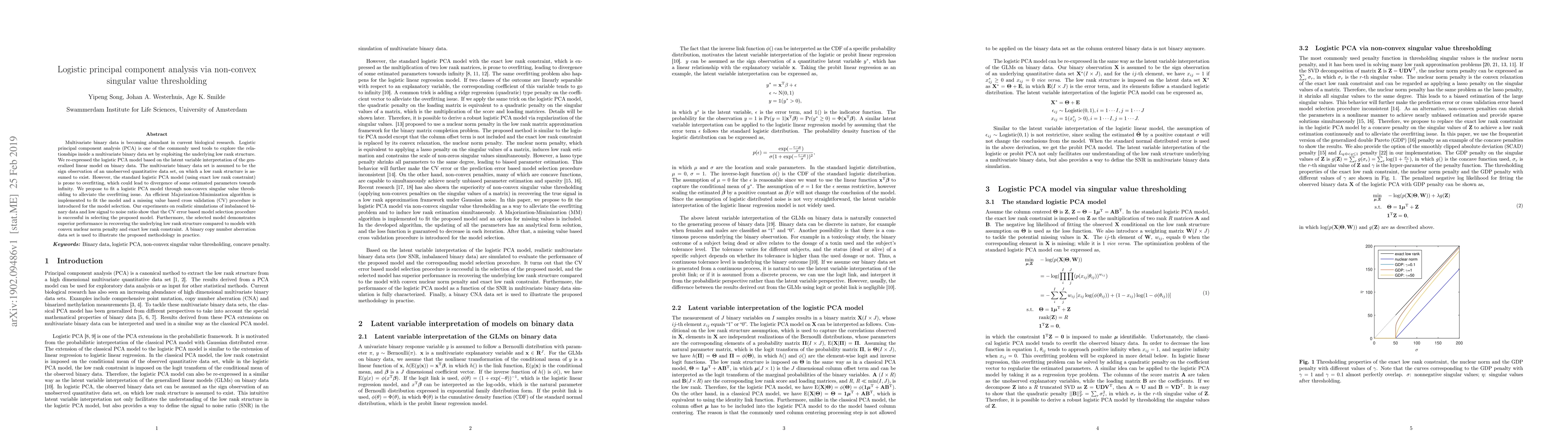 Multivariate binary data is becoming abundant in current biological research. Logistic principal component analysis (PCA) is one of the commonly used tools to explore the relationships inside a multivariate binary data set by exploiting the underlying low rank structure. We re-expressed the logistic PCA model based on the latent variable interpretation of the generalized linear model on binary data. The multivariate binary data set is assumed to be the sign observation of an unobserved quantitative data set, on which a low rank structure is assumed to exist. However, the standard logistic PCA model (using exact low rank constraint) is prone to overfitting, which could lead to divergence of some estimated parameters towards infinity. We propose to fit a logistic PCA model through non-convex singular value thresholding to alleviate the overfitting issue. An efficient Majorization-Minimization algorithm is implemented to fit the model and a missing value based cross validation (CV) procedure is introduced for the model selection. Our experiments on realistic simulations of imbalanced binary data and low signal to noise ratio show that the CV error based model selection procedure is successful in selecting the proposed model. Furthermore, the selected model demonstrates superior performance in recovering the underlying low rank structure compared to models with convex nuclear norm penalty and exact low rank constraint. A binary copy number aberration data set is used to illustrate the proposed methodology in practice.