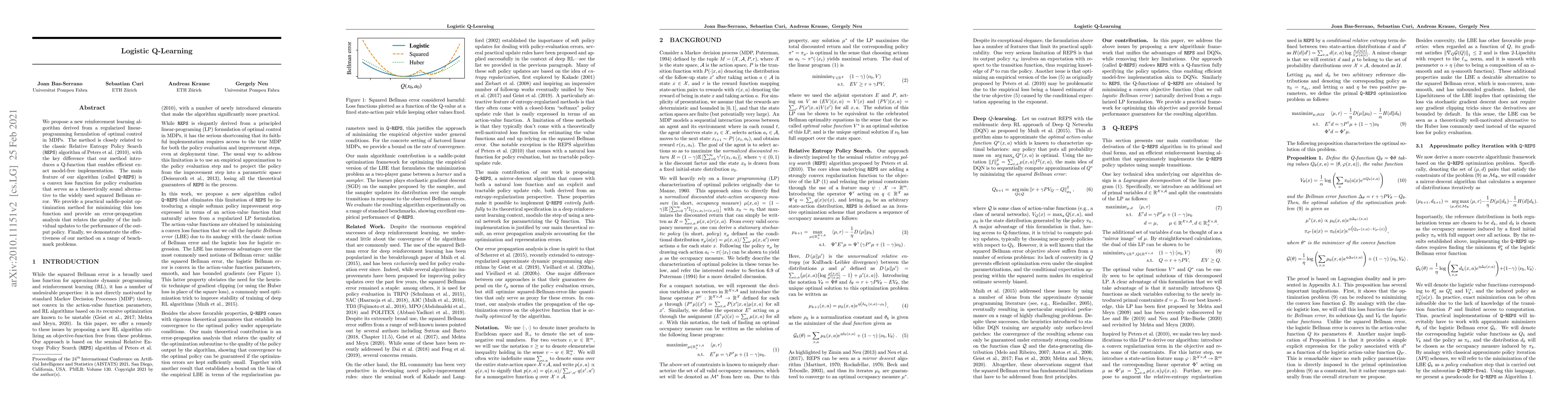 We propose a new reinforcement learning algorithm derived from a regularized linear-programming formulation of optimal control in MDPs. The method is closely related to the classic Relative Entropy Policy Search (REPS) algorithm of Peters et al. (2010), with the key difference that our method introduces a Q-function that enables efficient exact model-free implementation. The main feature of our algorithm (called QREPS) is a convex loss function for policy evaluation that serves as a theoretically sound alternative to the widely used squared Bellman error. We provide a practical saddle-point optimization method for minimizing this loss function and provide an error-propagation analysis that relates the quality of the individual updates to the performance of the output policy. Finally, we demonstrate the effectiveness of our method on a range of benchmark problems.