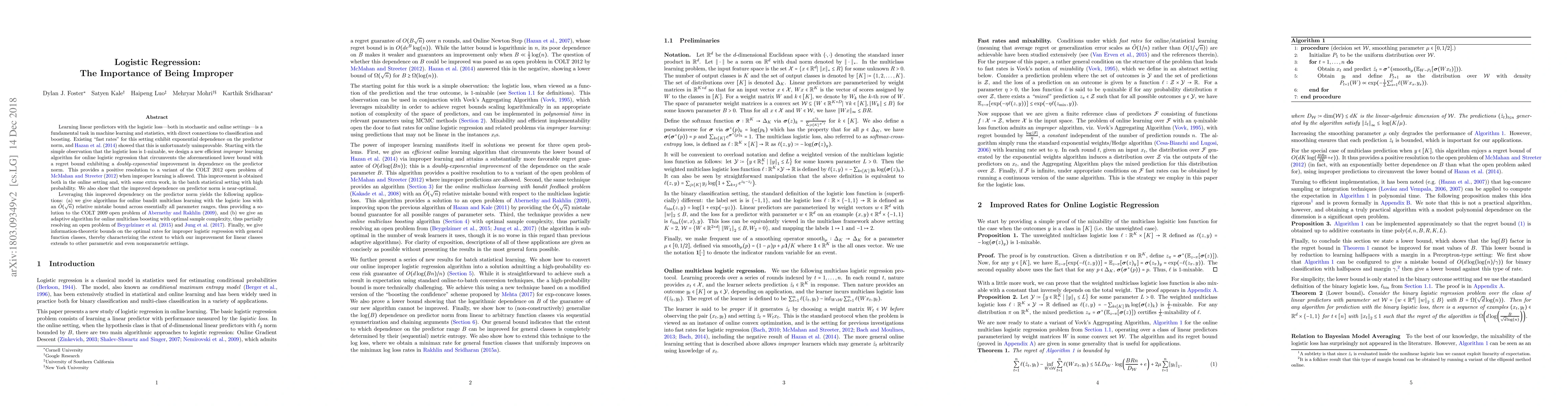 Learning linear predictors with the logistic loss---both in stochastic and online settings---is a fundamental task in machine learning and statistics, with direct connections to classification and boosting. Existing "fast rates" for this setting exhibit exponential dependence on the predictor norm, and Hazan et al. (2014) showed that this is unfortunately unimprovable. Starting with the simple observation that the logistic loss is $1$-mixable, we design a new efficient improper learning algorithm for online logistic regression that circumvents the aforementioned lower bound with a regret bound exhibiting a doubly-exponential improvement in dependence on the predictor norm. This provides a positive resolution to a variant of the COLT 2012 open problem of McMahan and Streeter (2012) when improper learning is allowed. This improvement is obtained both in the online setting and, with some extra work, in the batch statistical setting with high probability. We also show that the improved dependence on predictor norm is near-optimal. Leveraging this improved dependency on the predictor norm yields the following applications: (a) we give algorithms for online bandit multiclass learning with the logistic loss with an $\tilde{O}(\sqrt{n})$ relative mistake bound across essentially all parameter ranges, thus providing a solution to the COLT 2009 open problem of Abernethy and Rakhlin (2009), and (b) we give an adaptive algorithm for online multiclass boosting with optimal sample complexity, thus partially resolving an open problem of Beygelzimer et al. (2015) and Jung et al. (2017). Finally, we give information-theoretic bounds on the optimal rates for improper logistic regression with general function classes, thereby characterizing the extent to which our improvement for linear classes extends to other parametric and even nonparametric settings.