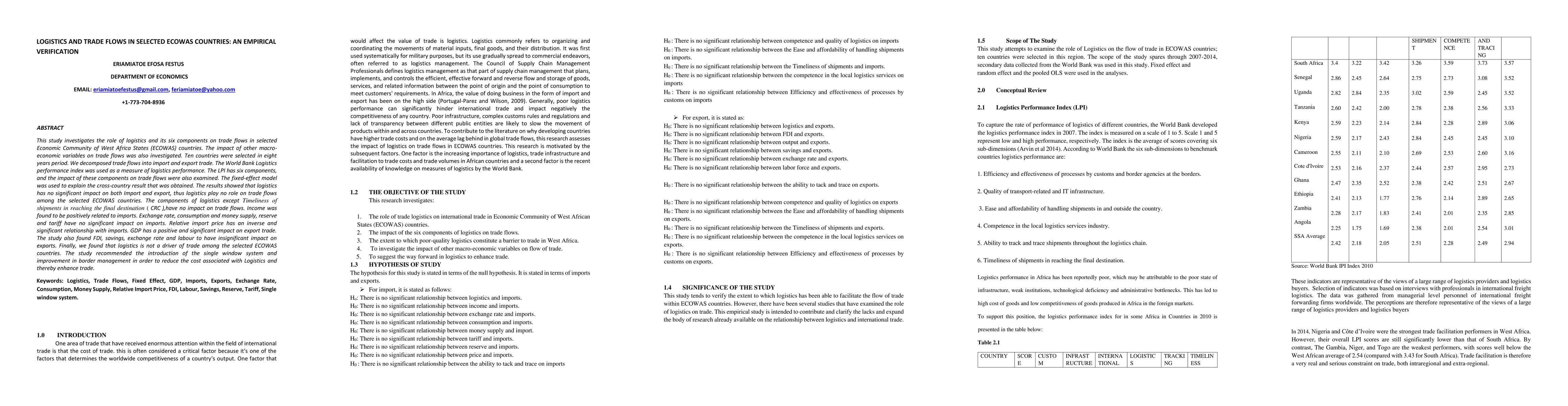 This study examines the impact of logistics and its components on trade flows in selected ECOWAS countries, finding that logistics has no significant effect on trade. Instead, income positively influences imports, while GDP boosts export trade. The research recommends enhancing logistics efficiency through systems like single windows and better border management.