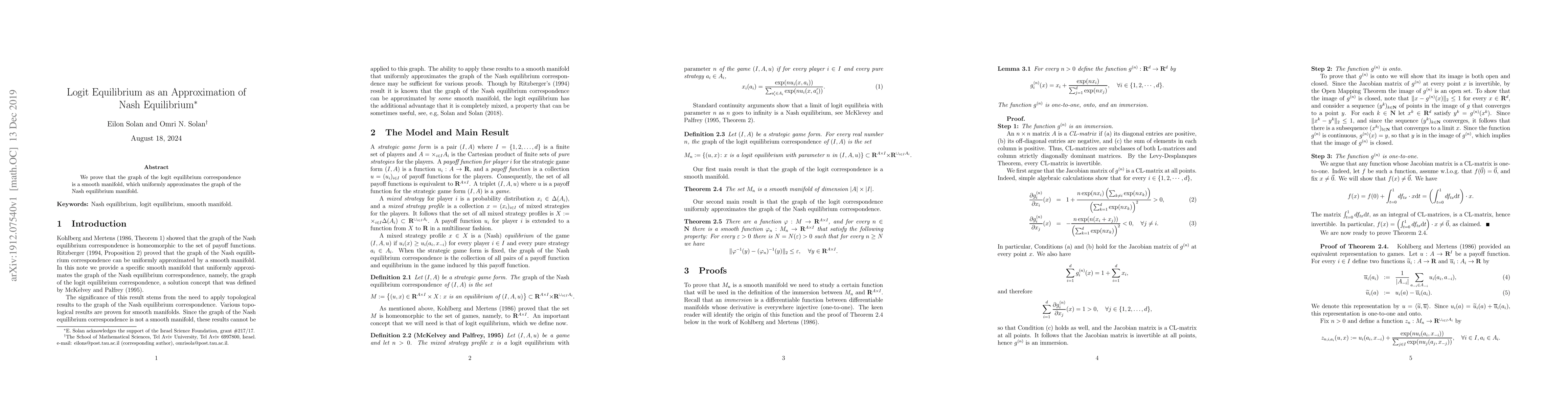 This research proves that logit equilibrium, a solution concept in game theory, smoothly approximates Nash equilibrium, providing a manifold representation that uniformly converges to the Nash equilibrium manifold.